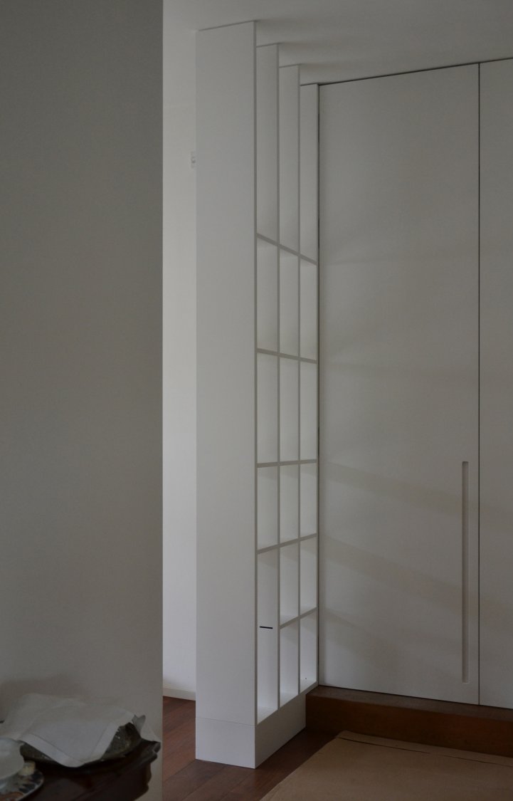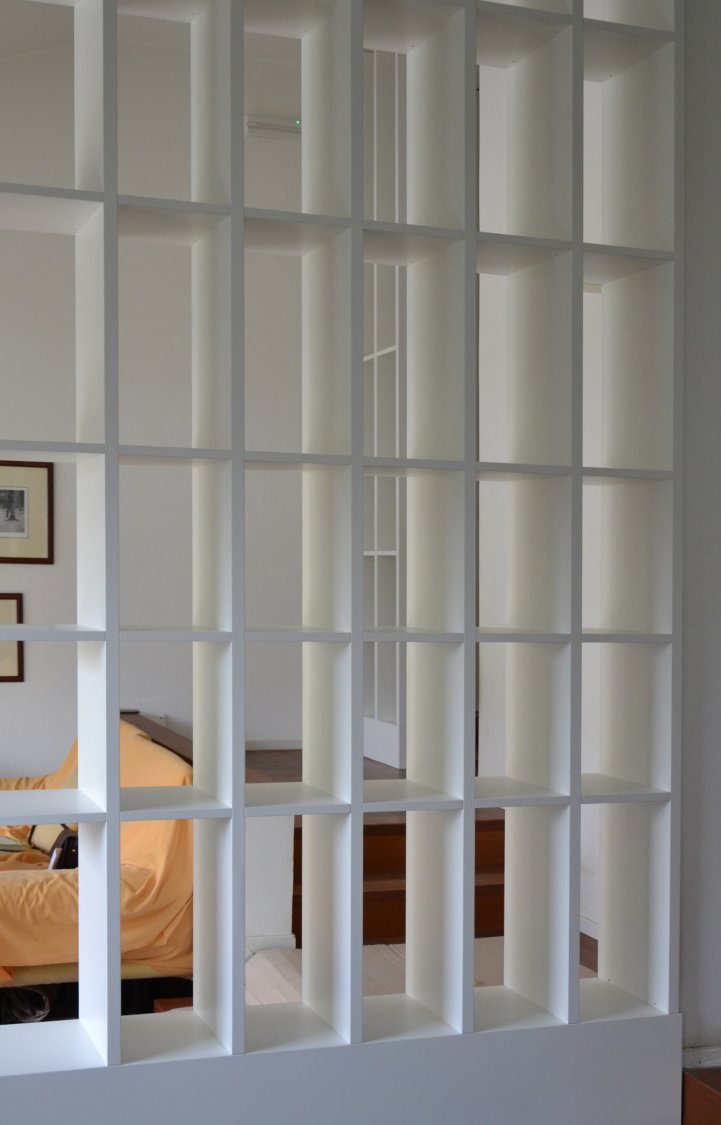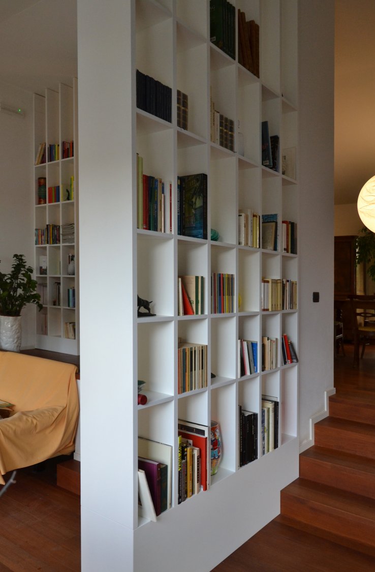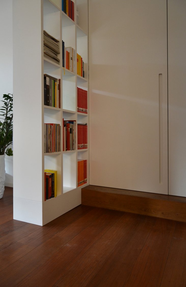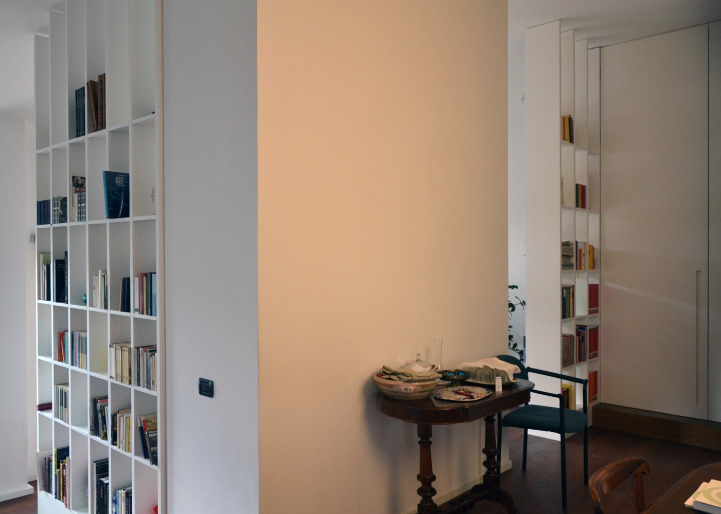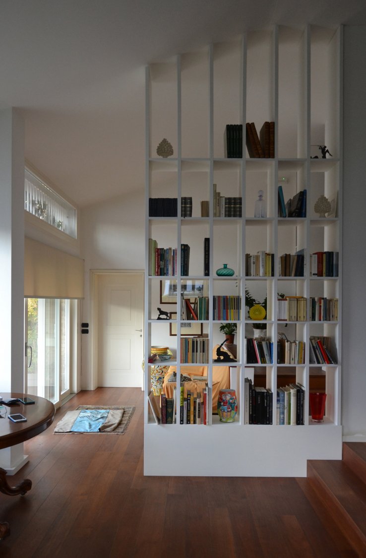 The request to work within the boundaries of a consolidated space of a single house with the purpose to significantly re-organize the hierarchy of functional areas and circulation flows is solved introducing few vertical elements which serve as bookcase and at the same time completely reshape the space without interrupting the visual connections with the indoor and outdoor environment. The design solution also solves the differences in the flooring and ceiling hight.