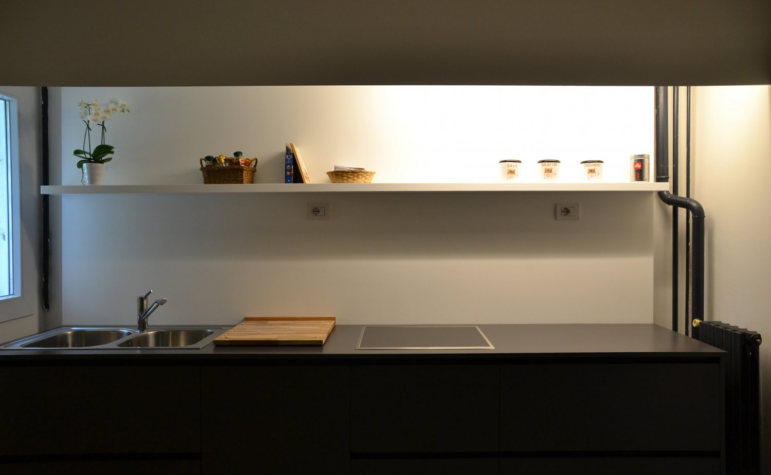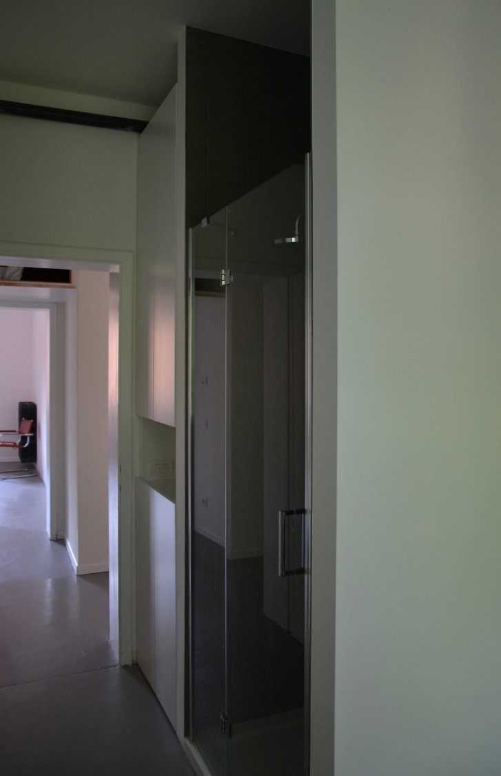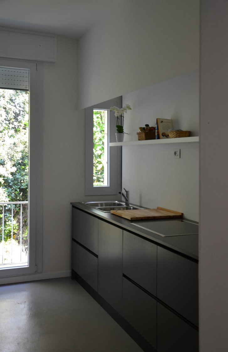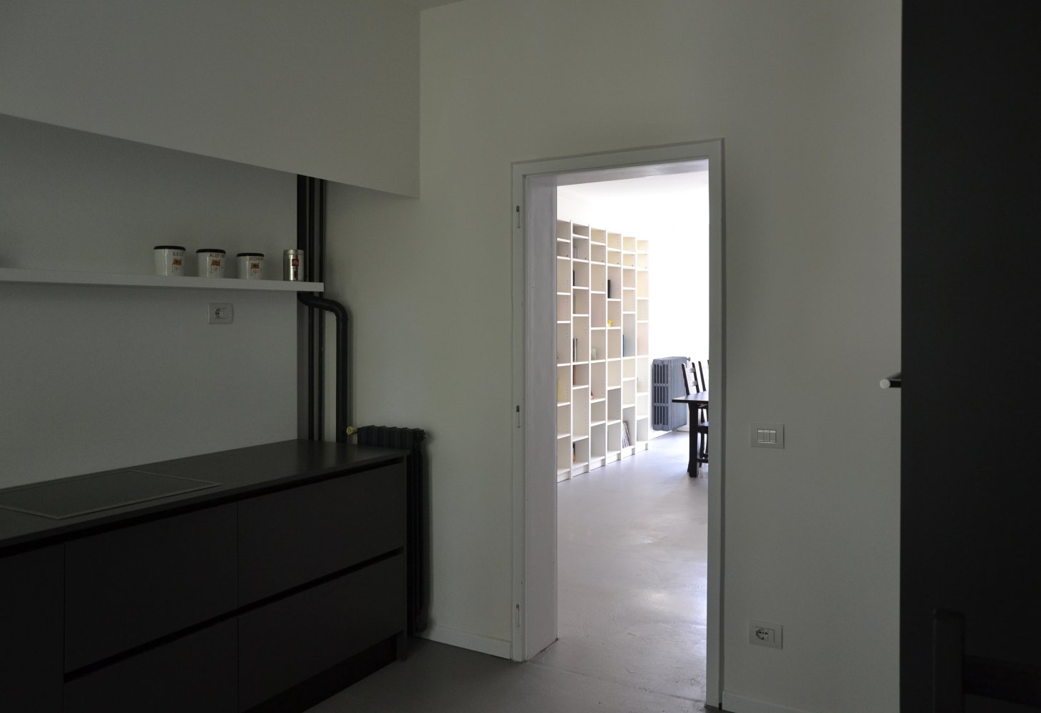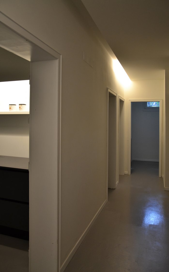 The households of this residential unit required to provide a low cost intervention able to ensure optimal living condition for the following five years. Therefore the refurbishment is based on two main concepts: to operate a general redraw of the space through minimal changes and to unify it using a grey textured flooring.