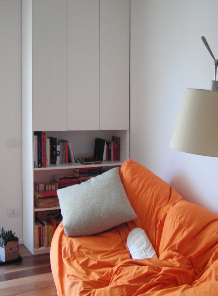 The need to provide a small residential unit of a workspace led the project to optimize connections and services. Few pieces of furniture, characterized by a minimal design, are able to change the function and the relation of the spaces. Reflecting on the white surface of the walls and of the furniture, the light plays with the texture of the walnut wooden floor.