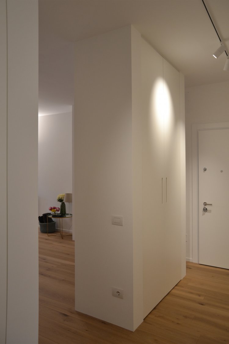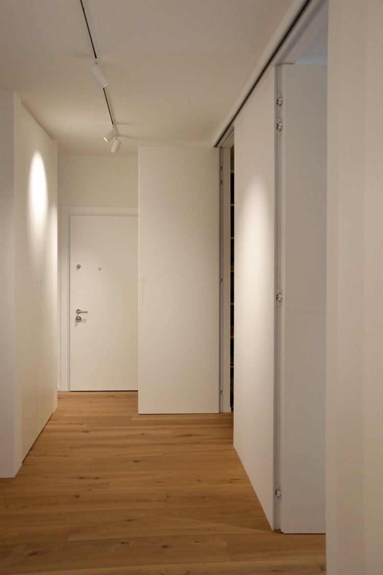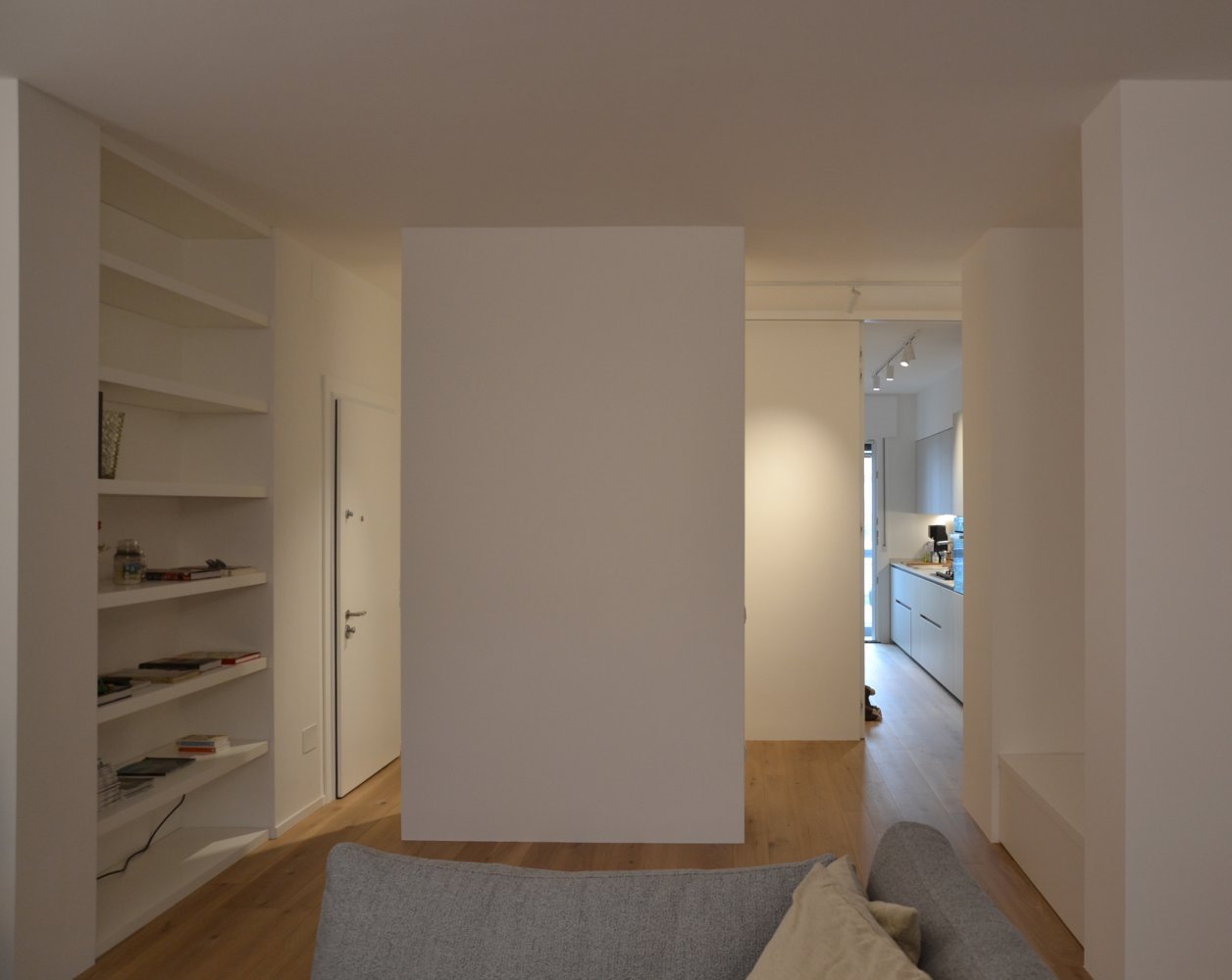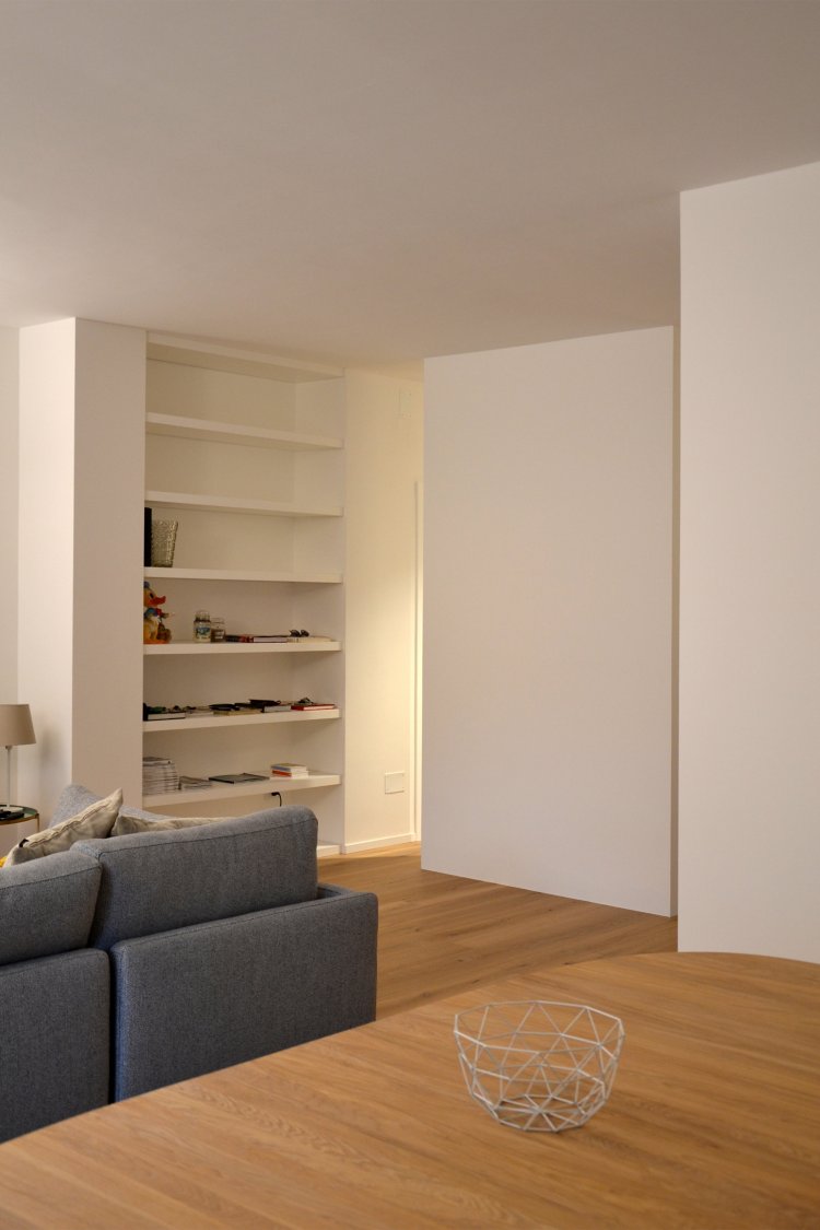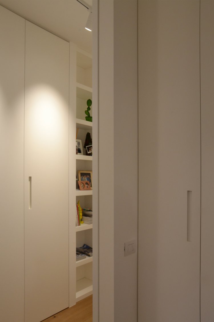 A large flat organized on a very classical circulation model that limited a functional use of spaces, is totally reshaped replacing most of existing walls with containing volumes that articulate indoor spaces according to an innovative and flexible approach. These volumes act as buffer elements while expanding the storage capacity and introducing new spaces for reading or relaxing. Sliding walls are instead adopted to separate the private spaces from the public ones.