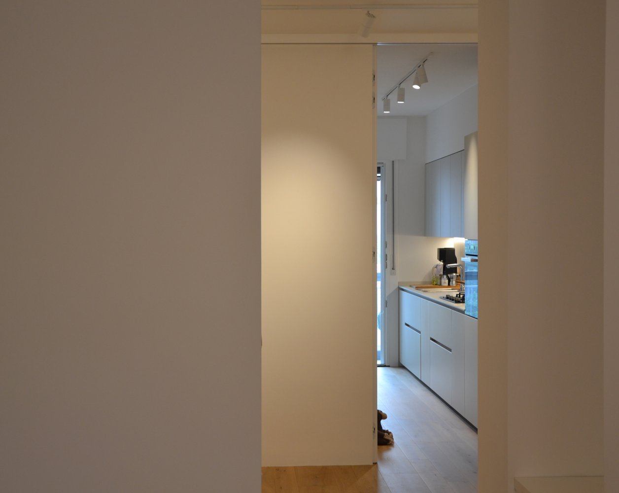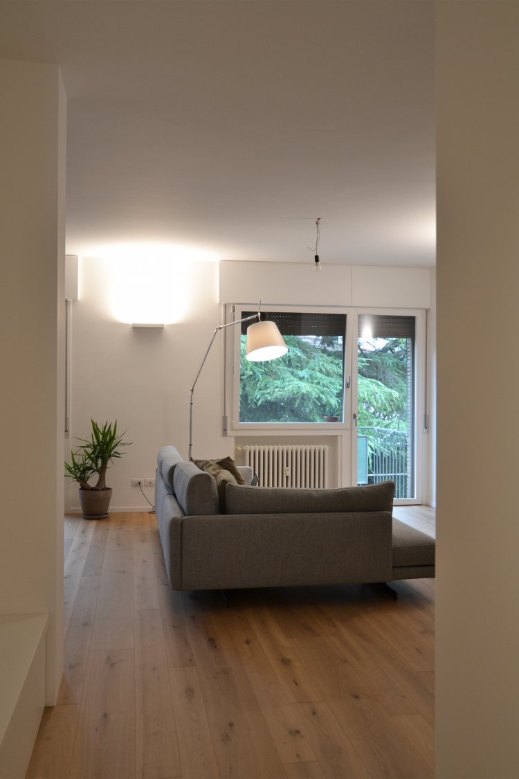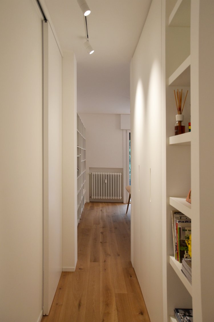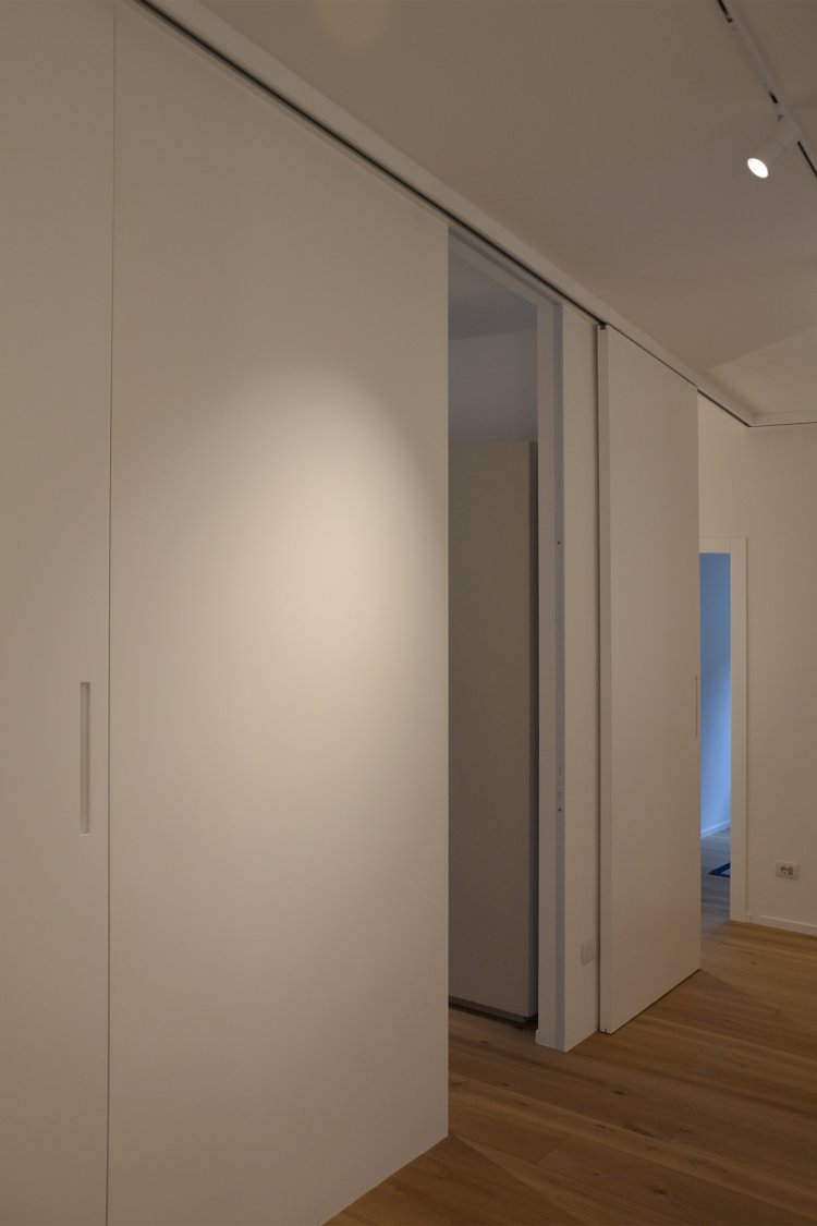 A large flat organized on a very classical circulation model that limited a functional use of spaces, is totally reshaped replacing most of existing walls with containing volumes that articulate indoor spaces according to an innovative and flexible approach. These volumes act as buffer elements while expanding the storage capacity and introducing new spaces for reading or relaxing. Sliding walls are instead adopted to separate the private spaces from the public ones.