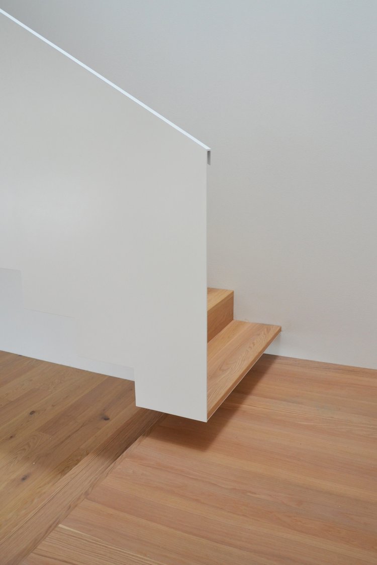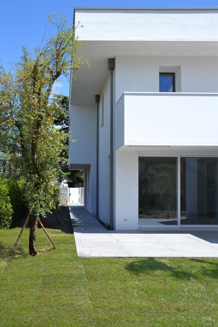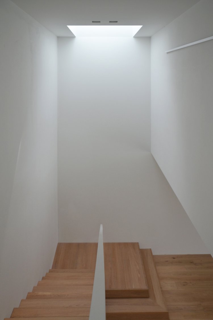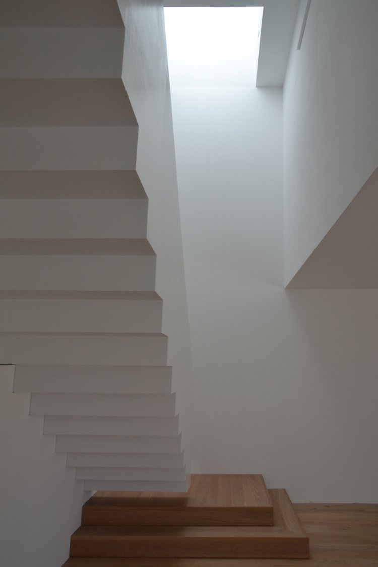 Questa abitazione in due livelli è basata su una chiara suddivisione funzionale in due blocchi, separati da uno spazio verticale in cui una scala a sbalzo trova posto come una scultura indirizzando tutti i flussi distributivi principali. Due lucernari permettono alla luce naturale di spiovere sull’ingresso, sulla parete e sulla scala creando un’inaspettata atmosfera che varia nell’arco del giorno. Gli spazi interni trovano la loro naturale estensione nel giardino e nelle terrazze che assicurano un adeguato ombreggiamento in estate.
