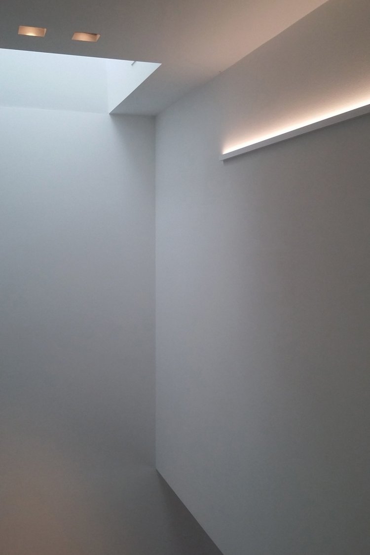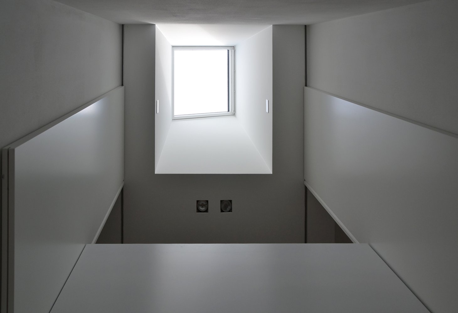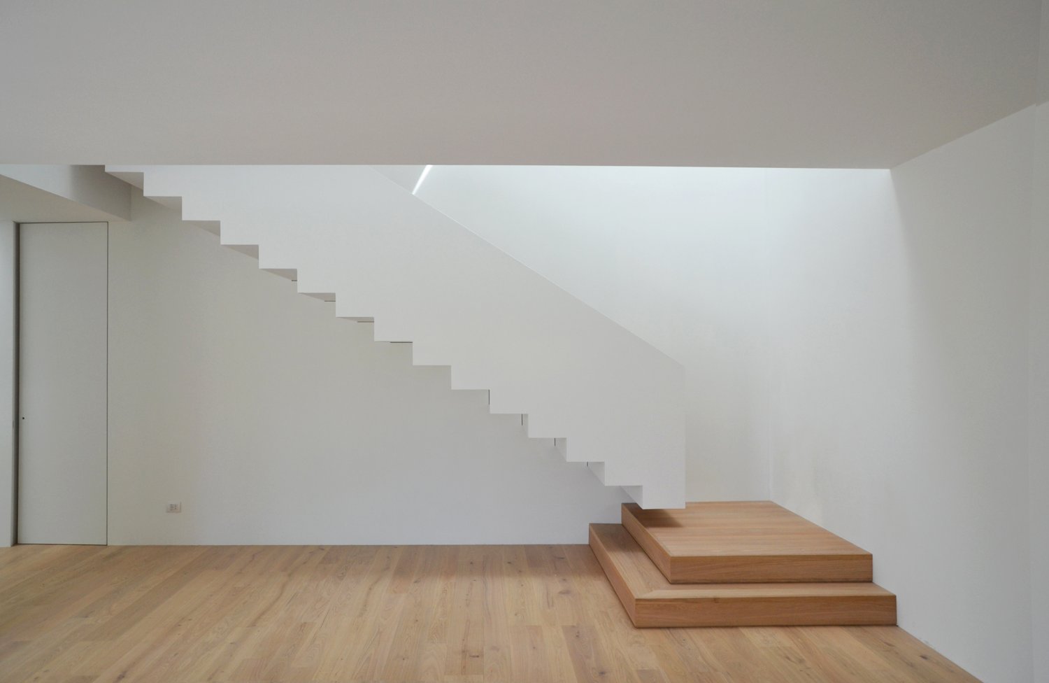 Questa abitazione in due livelli è basata su una chiara suddivisione funzionale in due blocchi, separati da uno spazio verticale in cui una scala a sbalzo trova posto come una scultura indirizzando tutti i flussi distributivi principali. Due lucernari permettono alla luce naturale di spiovere sull’ingresso, sulla parete e sulla scala creando un’inaspettata atmosfera che varia nell’arco del giorno. Gli spazi interni trovano la loro naturale estensione nel giardino e nelle terrazze che assicurano un adeguato ombreggiamento in estate.