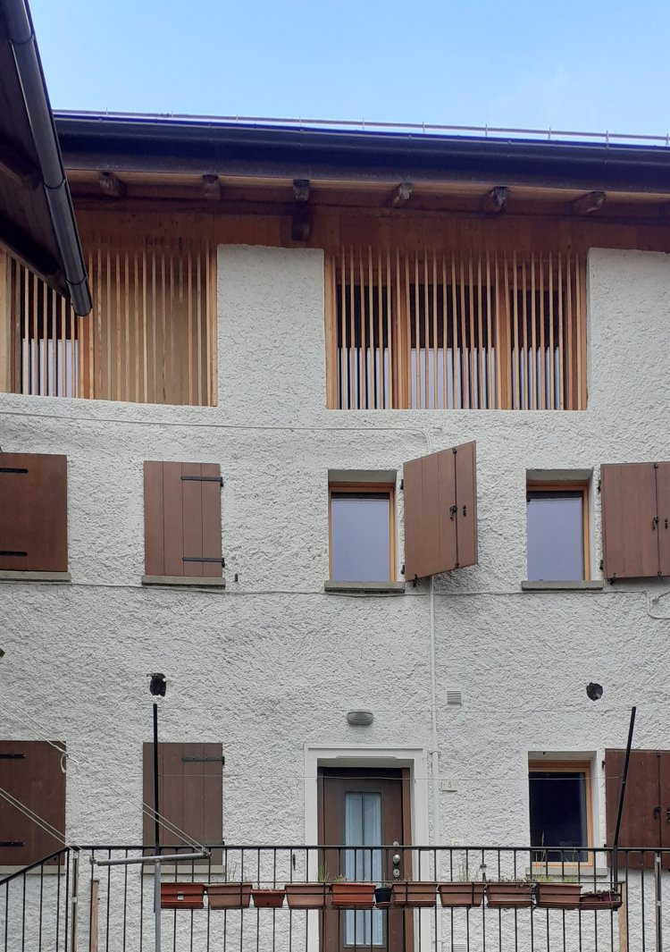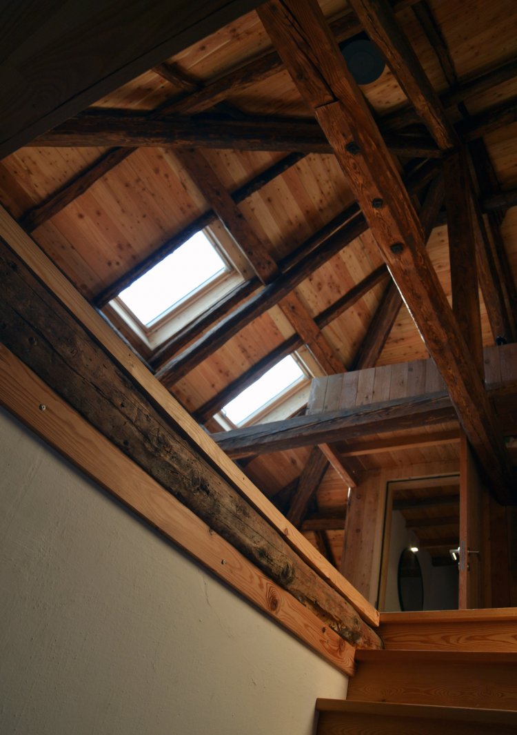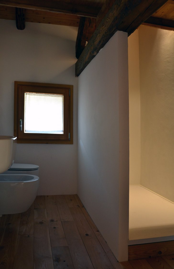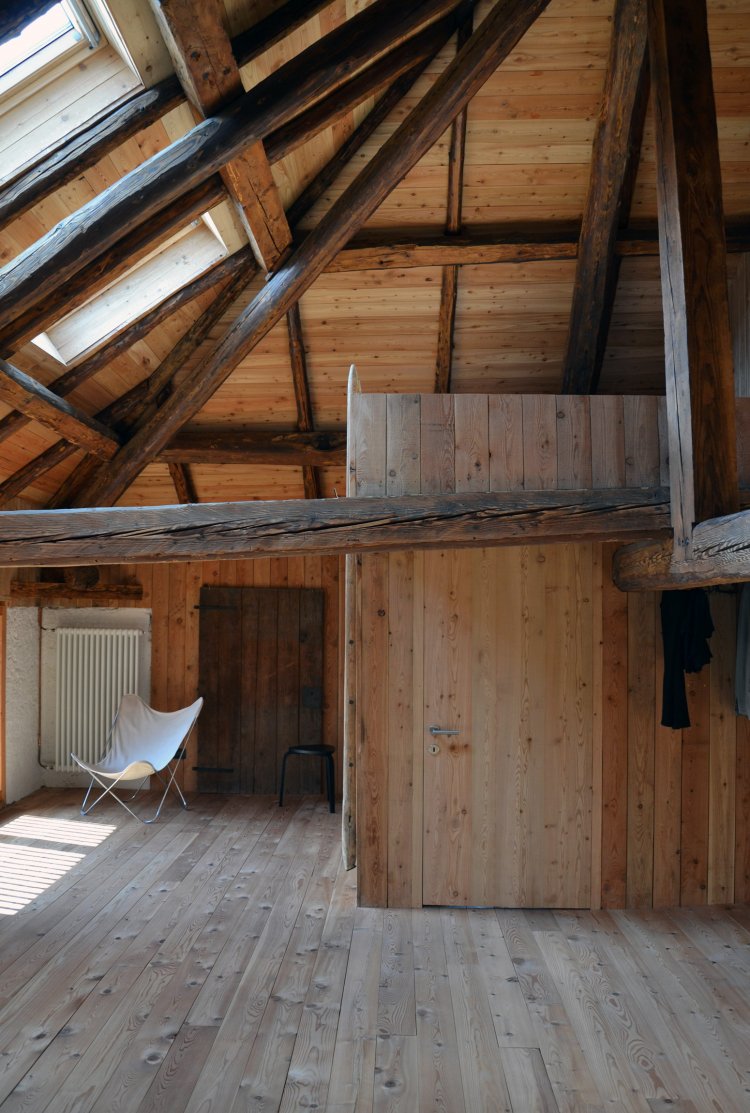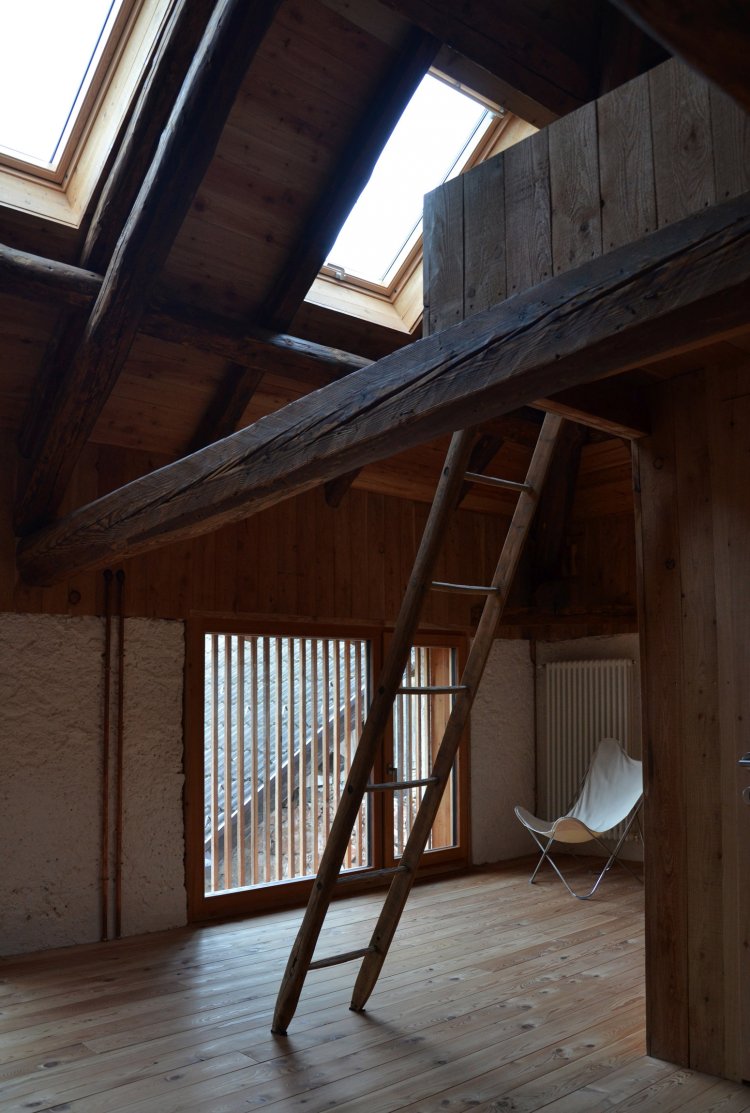 Il grande sottotetto di un edificio tradizionale in un piccolo borgo montano è stato trasformato in un loft dal design minimale che mette in risalto la configurazione della struttura originale del tetto in legno e la qualità dei materiali tradizionali adottati nel processo di ristrutturazione. In continuità con la copertura inclinata, un rivestimento in larice completa le pareti a secco opportunamente isolate, creando un ambiente suggestivo dove un piccolo box ospita tutte le funzioni di servizio.