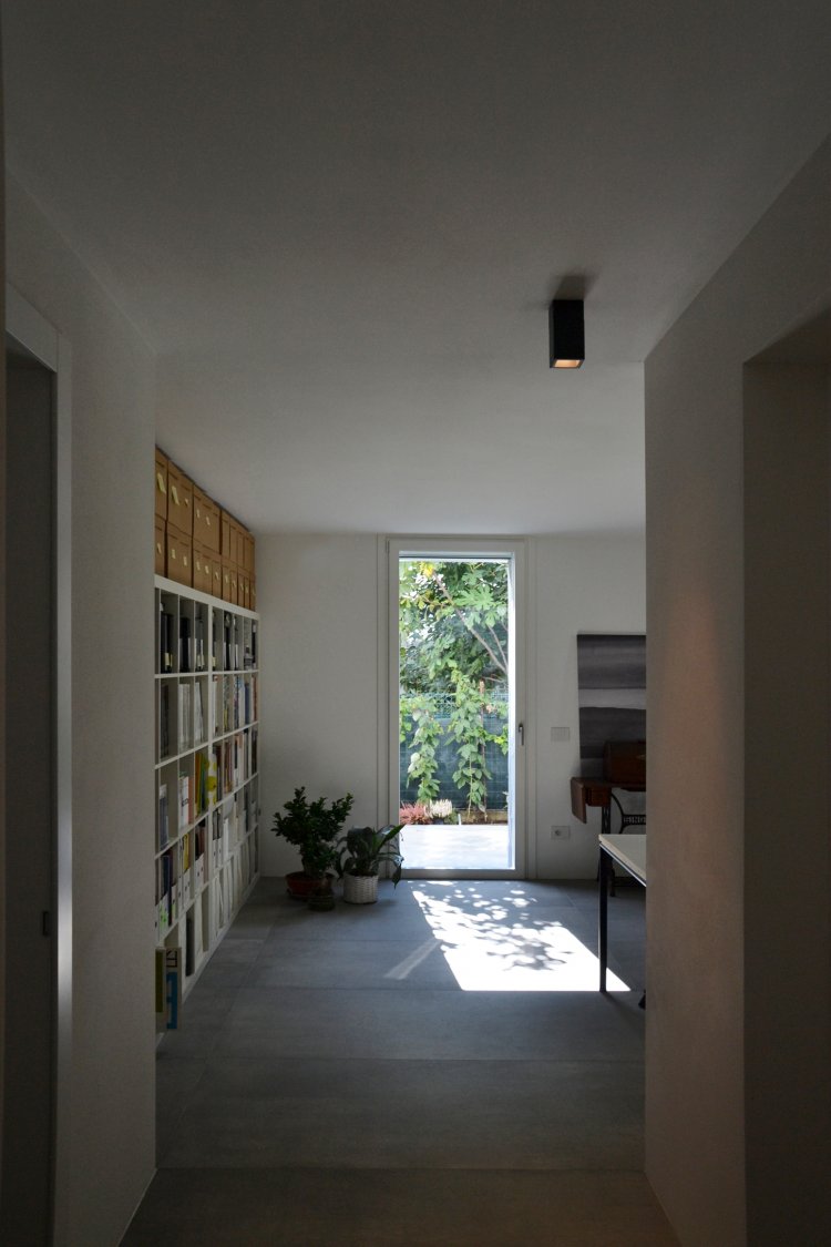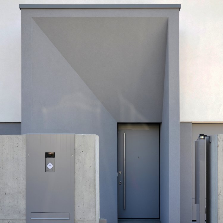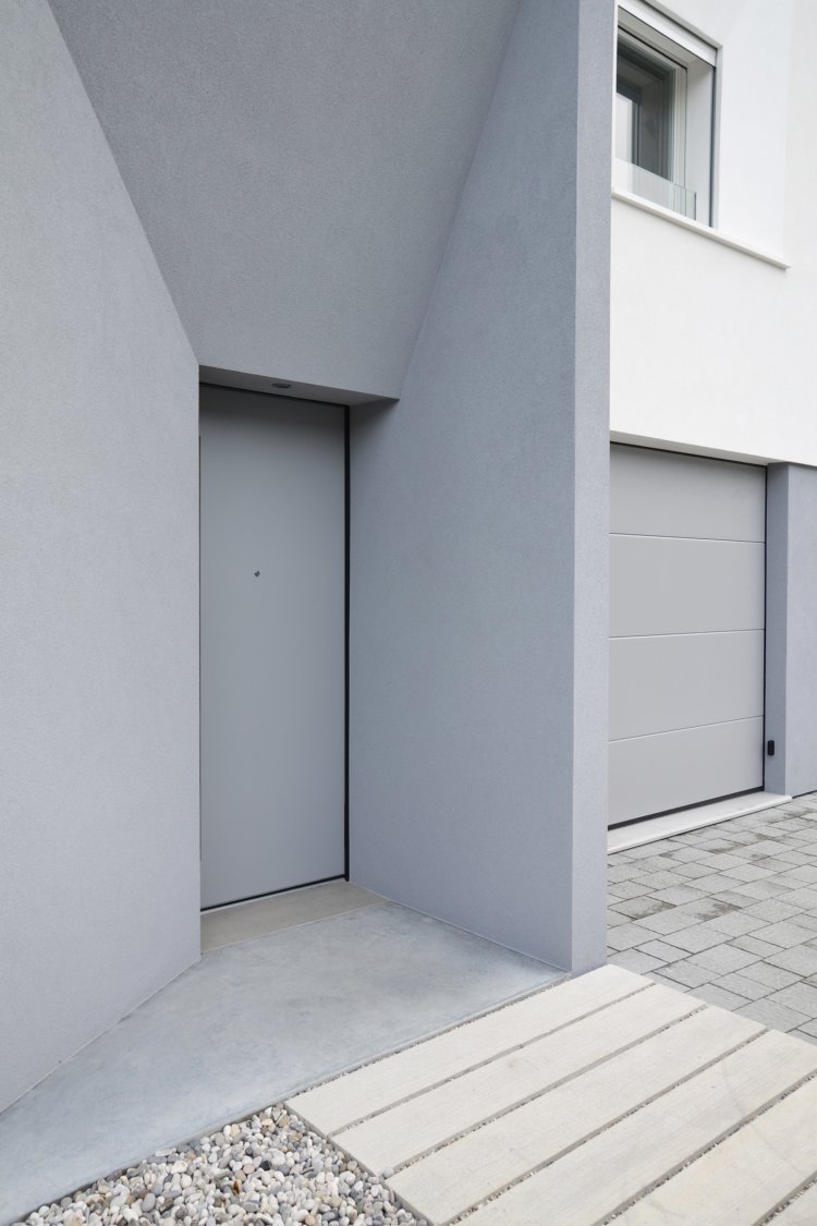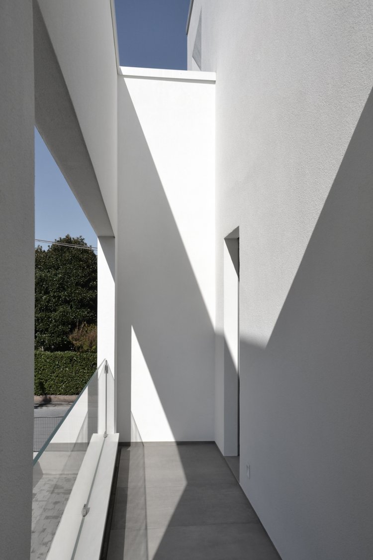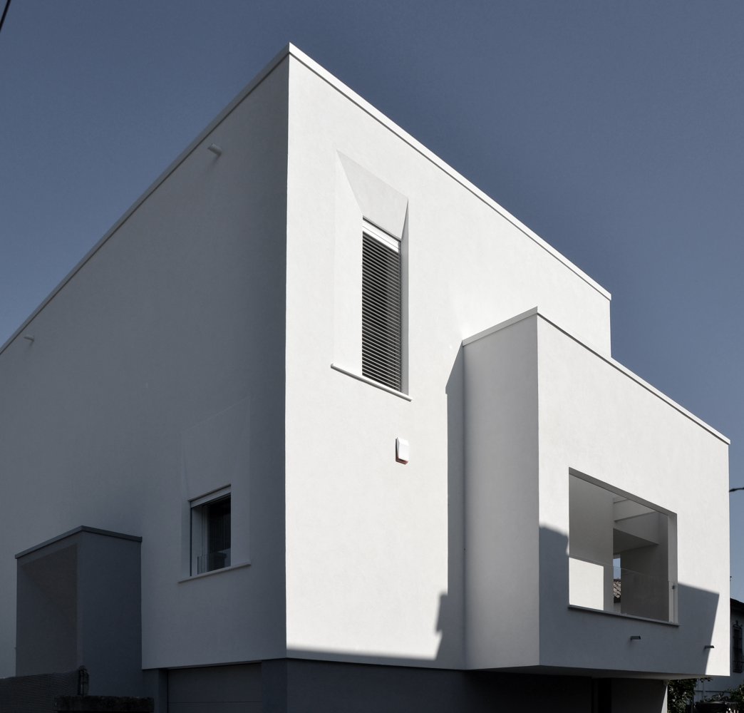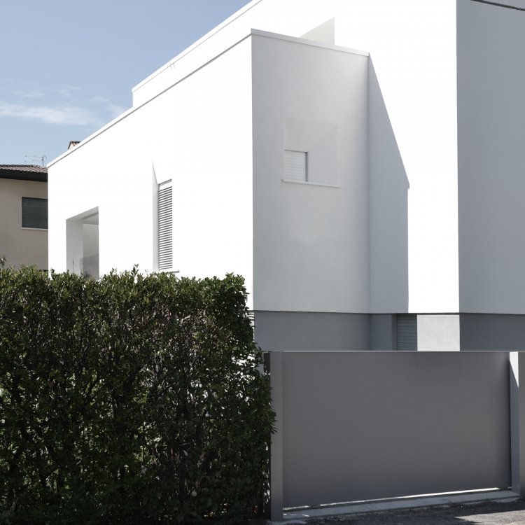 La principale sfida progettuale risiede nel realizzare un edificio a energia quasi zero, capace di ospitare due unità residenziali, senza apparire come una convenzionale bifamiliare dal tipico aspetto simmetrico. L'intero progetto si basa sull'ottimizzazione dei volumi e dell'orientamento rispetto al lotto disponibile per ottenere un volume tanto ermetico sul fronte strada a nord quanto aperto sul lato sud al fine di massimizzare i guadagni passivi e l'apporto di luce. Gli spazi interni si susseguono verticalmente scanditi dalla luce naturale proveniente dai lucernari di copertura e dalle terrazze, enfatizzando la consistenza dei materiali.
