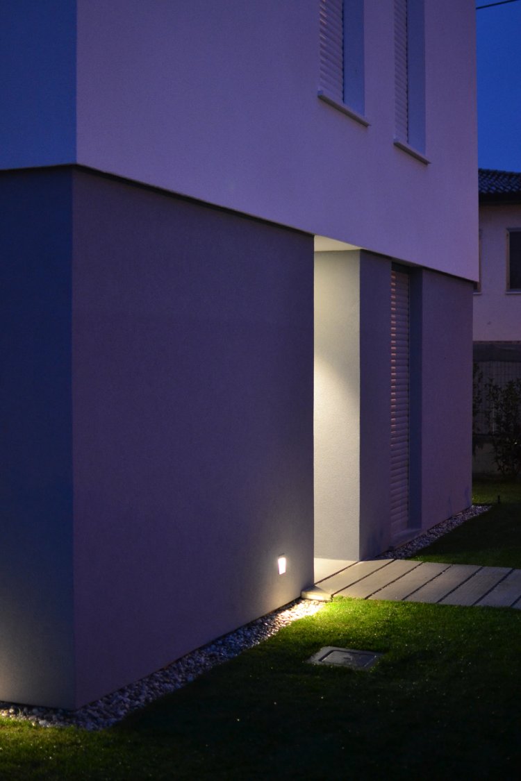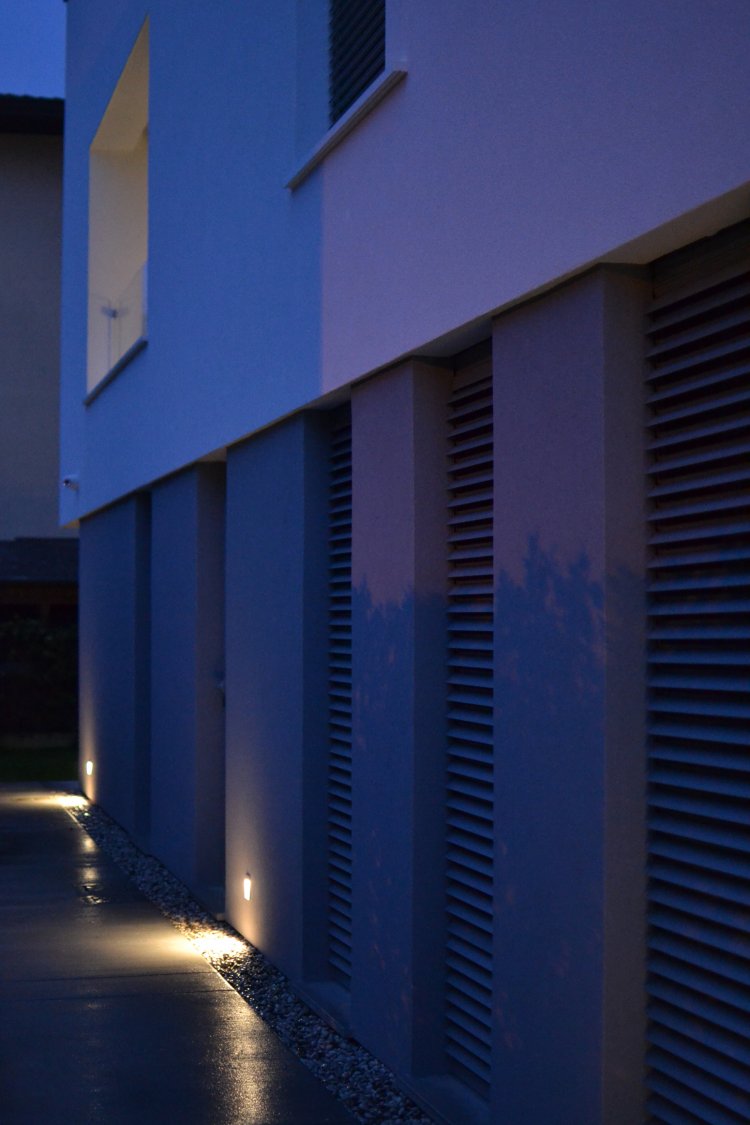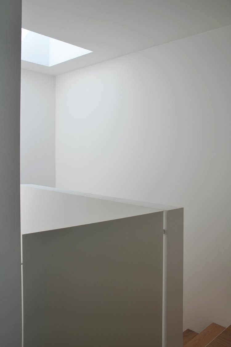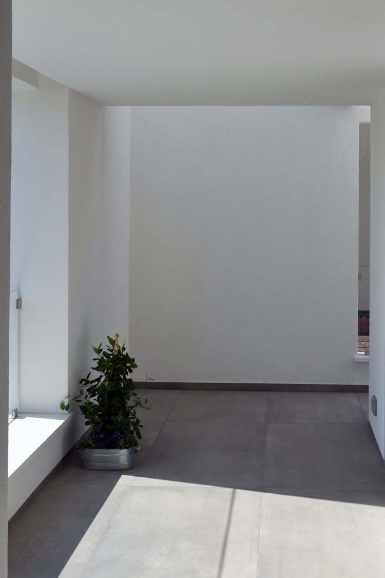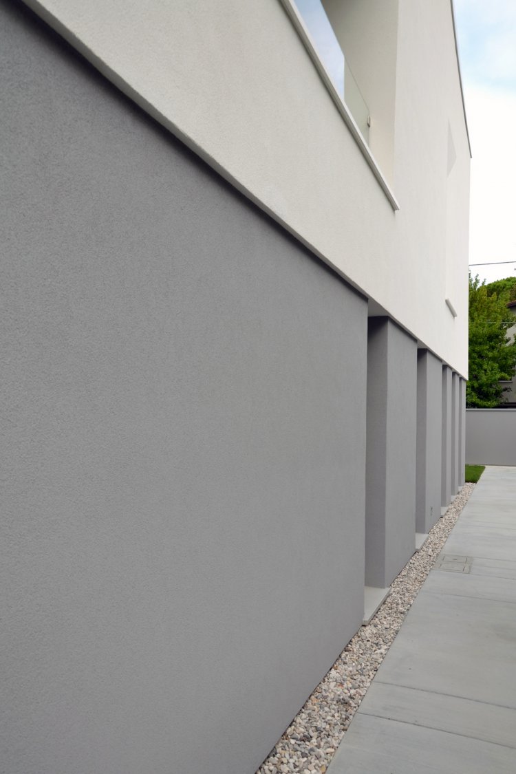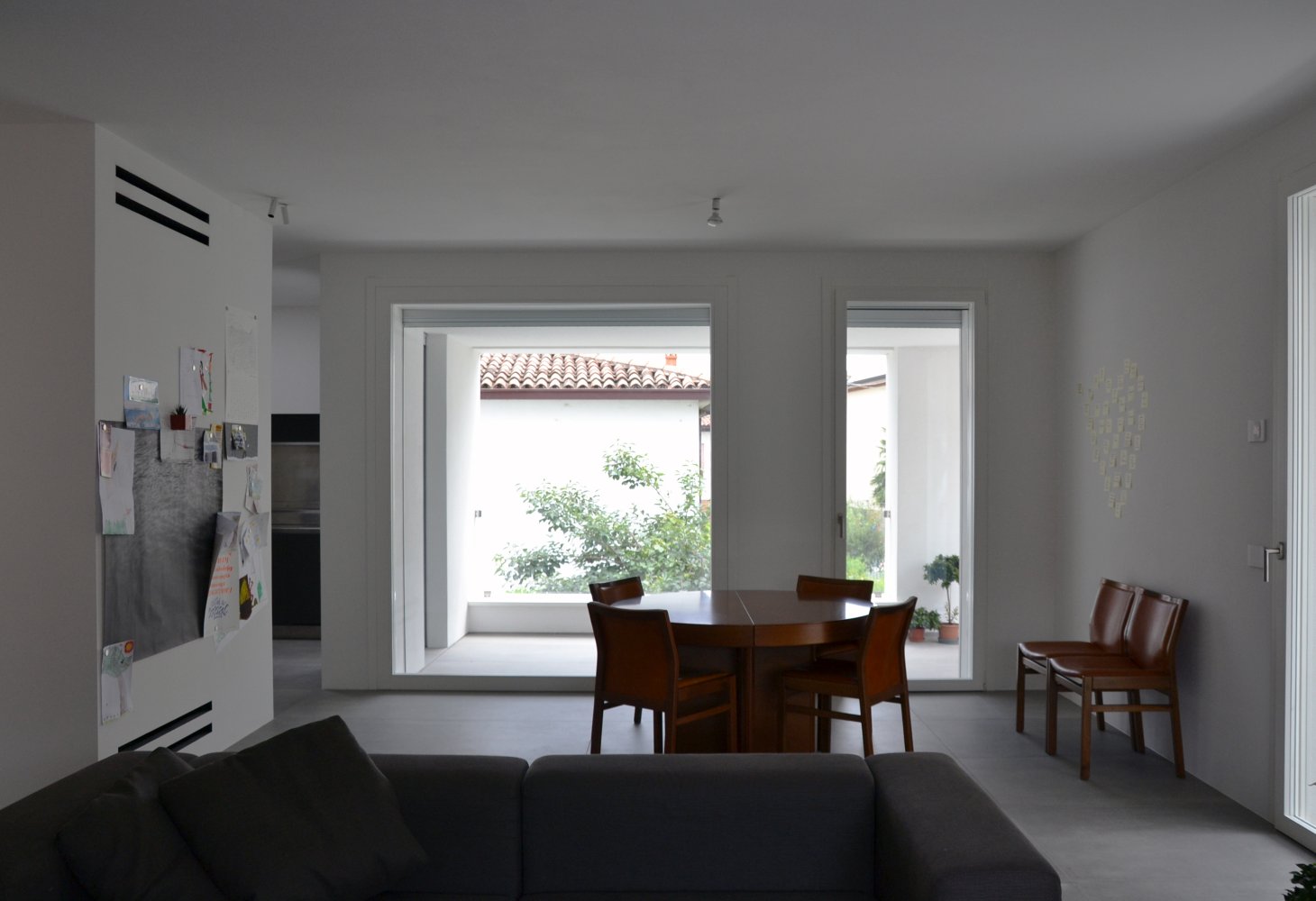 La principale sfida progettuale risiede nel realizzare un edificio a energia quasi zero, capace di ospitare due unità residenziali, senza apparire come una convenzionale bifamiliare dal tipico aspetto simmetrico. L'intero progetto si basa sull'ottimizzazione dei volumi e dell'orientamento rispetto al lotto disponibile per ottenere un volume tanto ermetico sul fronte strada a nord quanto aperto sul lato sud al fine di massimizzare i guadagni passivi e l'apporto di luce. Gli spazi interni si susseguono verticalmente scanditi dalla luce naturale proveniente dai lucernari di copertura e dalle terrazze, enfatizzando la consistenza dei materiali.