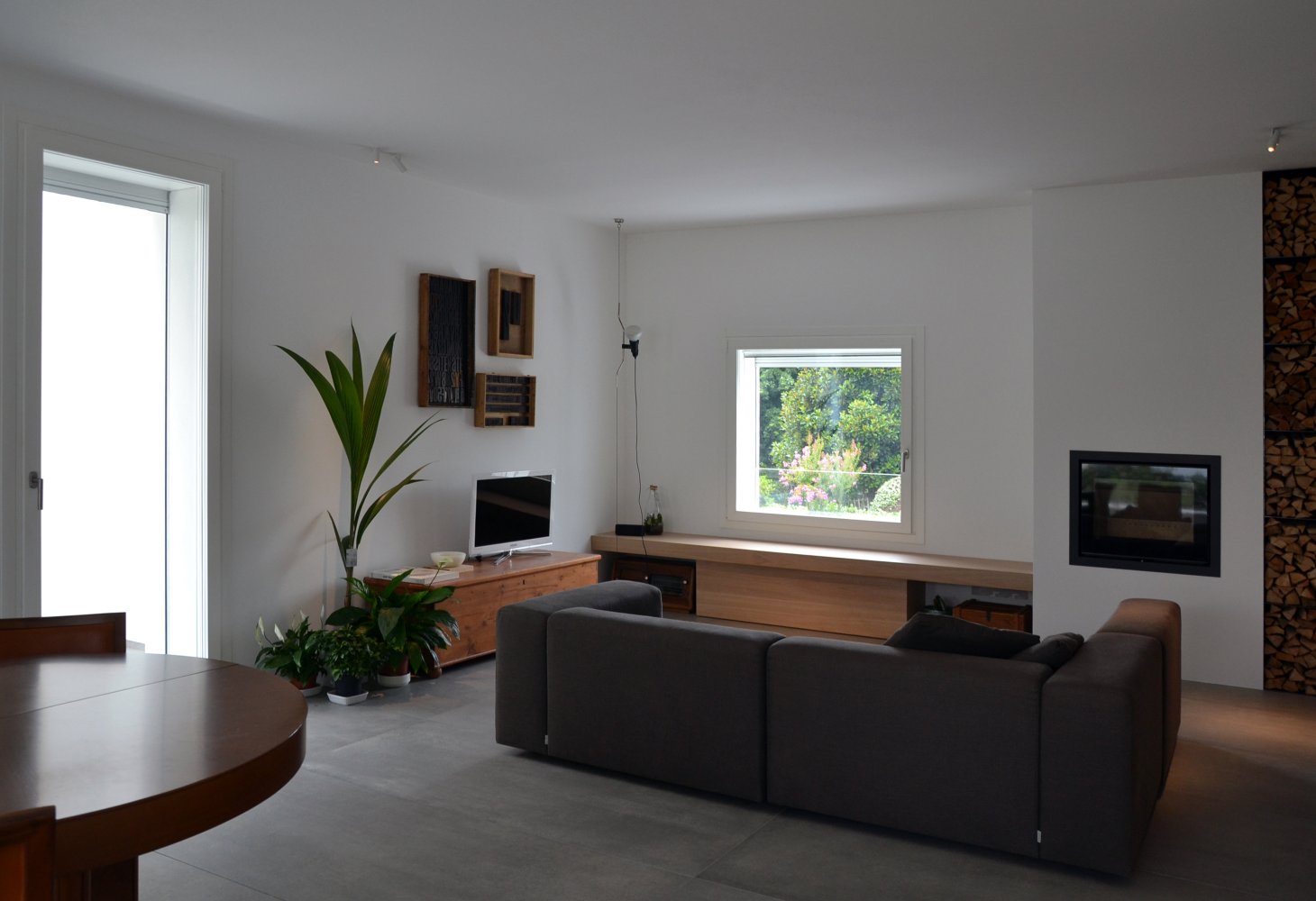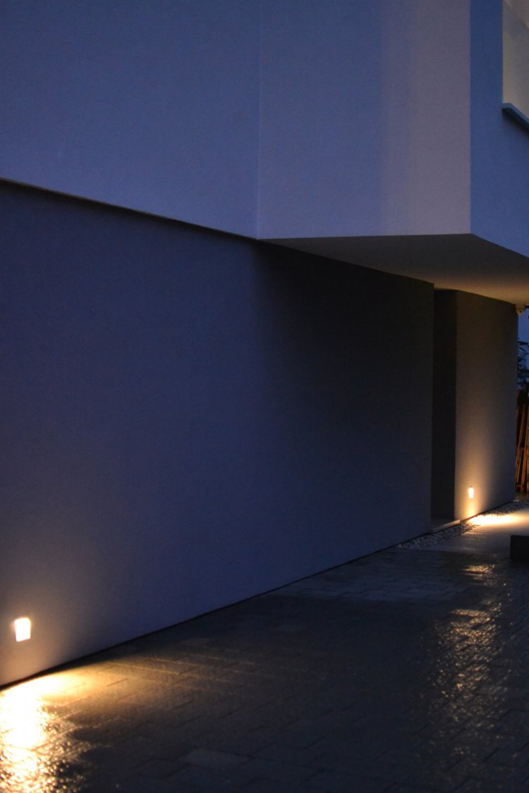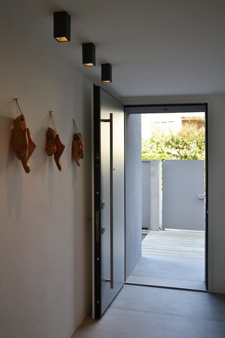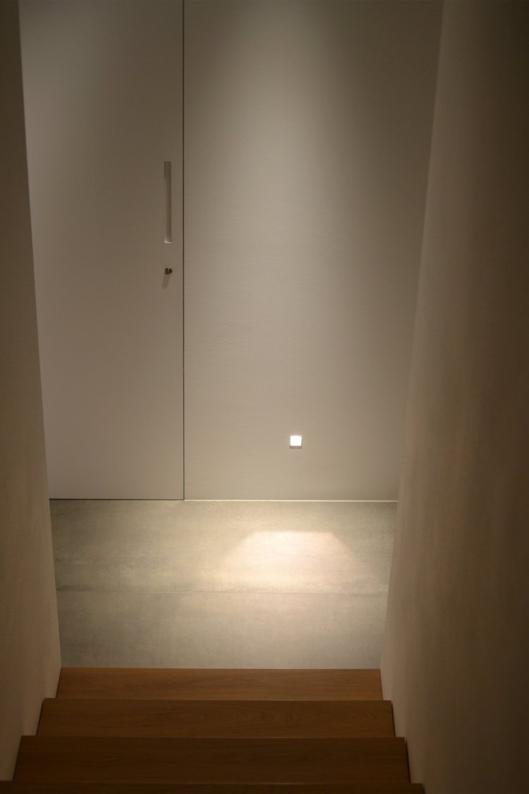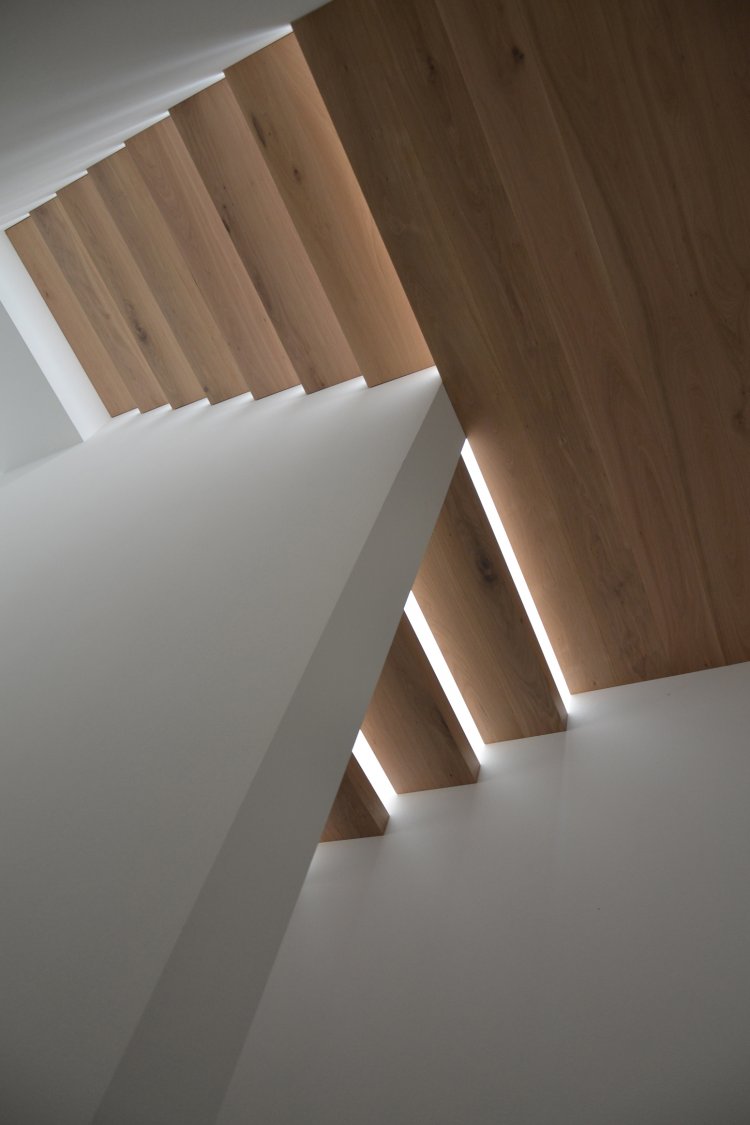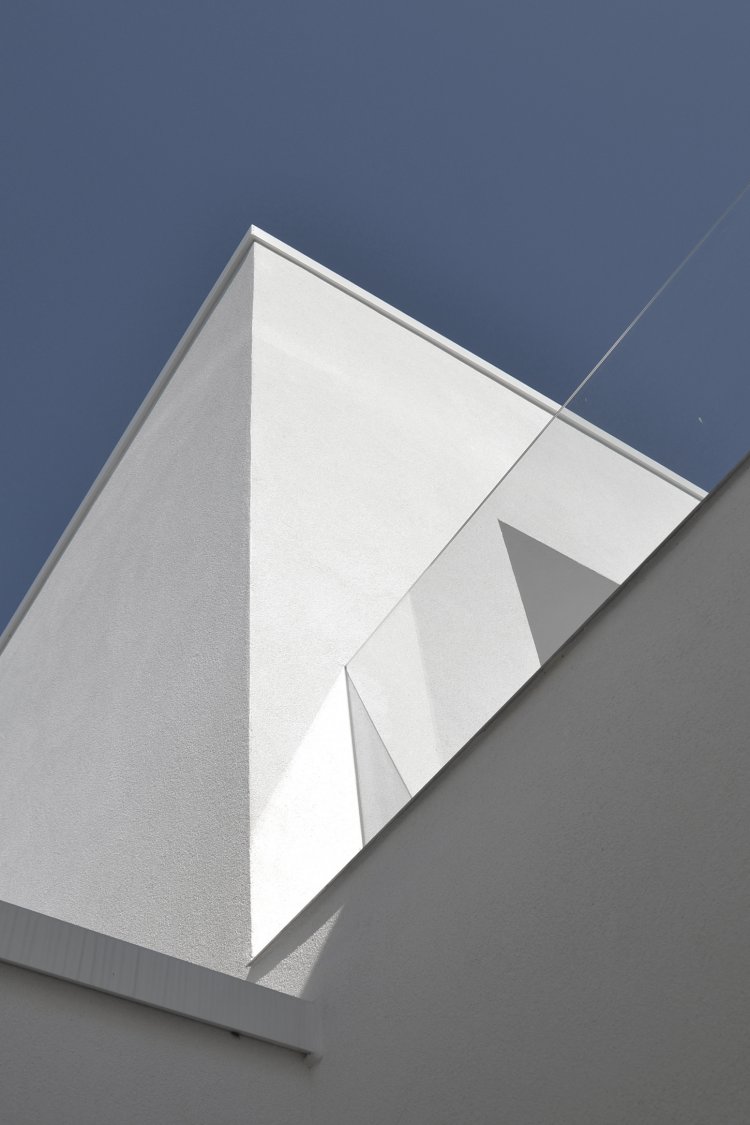 La principale sfida progettuale risiede nel realizzare un edificio a energia quasi zero, capace di ospitare due unità residenziali, senza apparire come una convenzionale bifamiliare dal tipico aspetto simmetrico. L'intero progetto si basa sull'ottimizzazione dei volumi e dell'orientamento rispetto al lotto disponibile per ottenere un volume tanto ermetico sul fronte strada a nord quanto aperto sul lato sud al fine di massimizzare i guadagni passivi e l'apporto di luce. Gli spazi interni si susseguono verticalmente scanditi dalla luce naturale proveniente dai lucernari di copertura e dalle terrazze, enfatizzando la consistenza dei materiali.