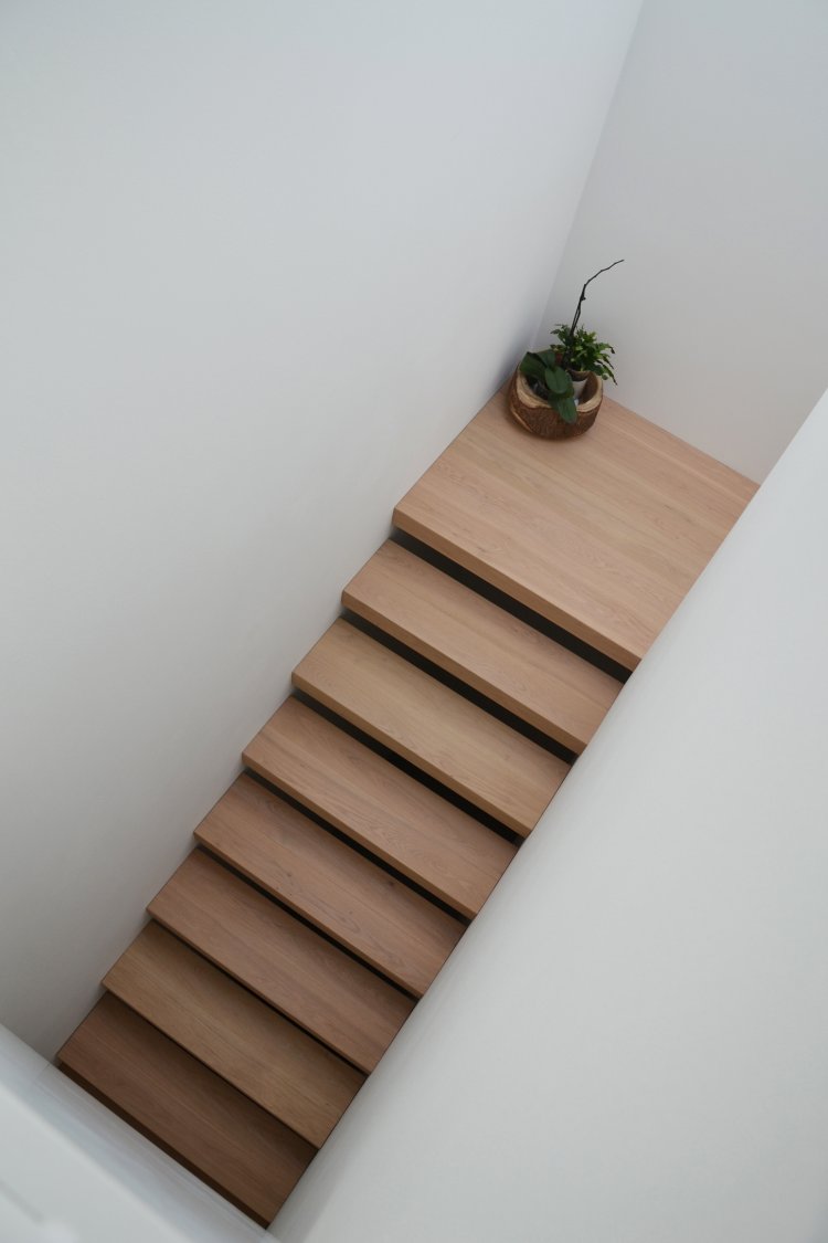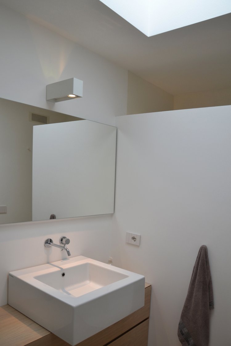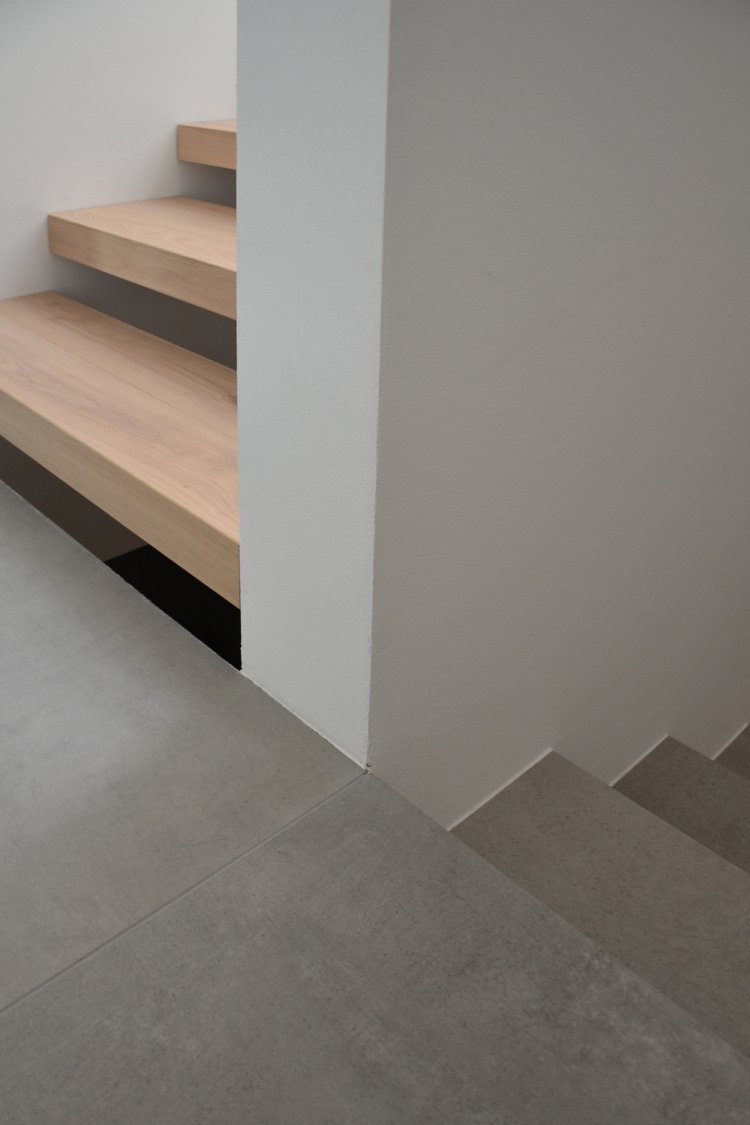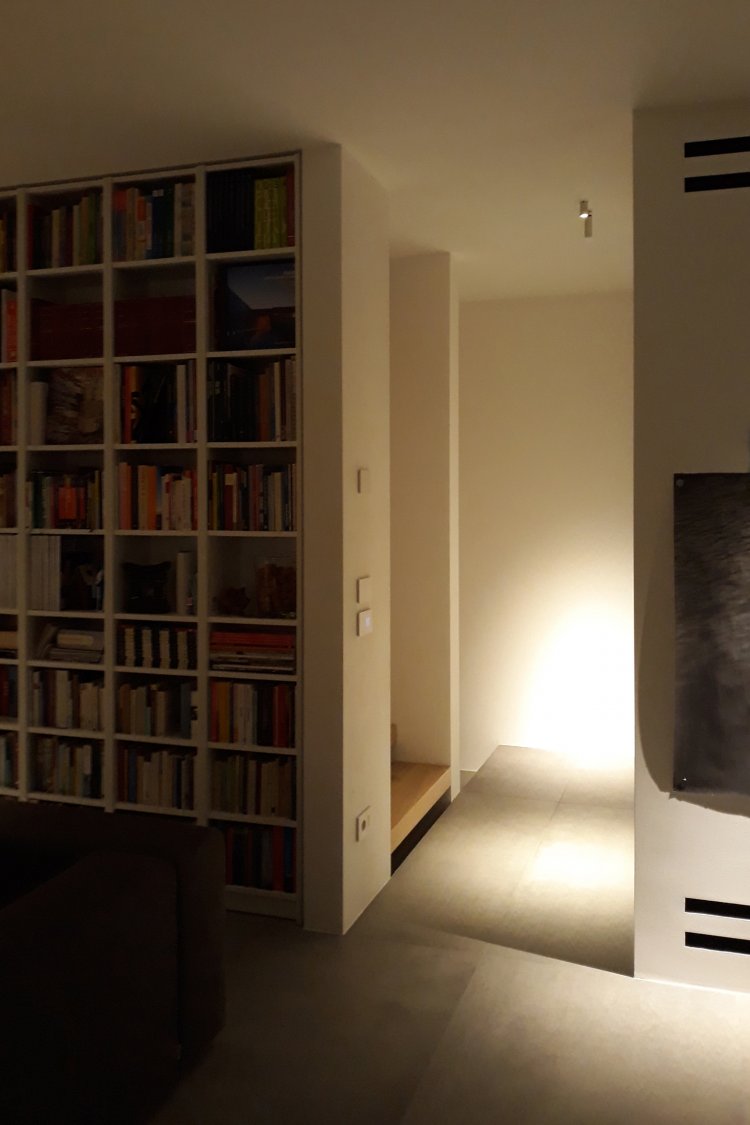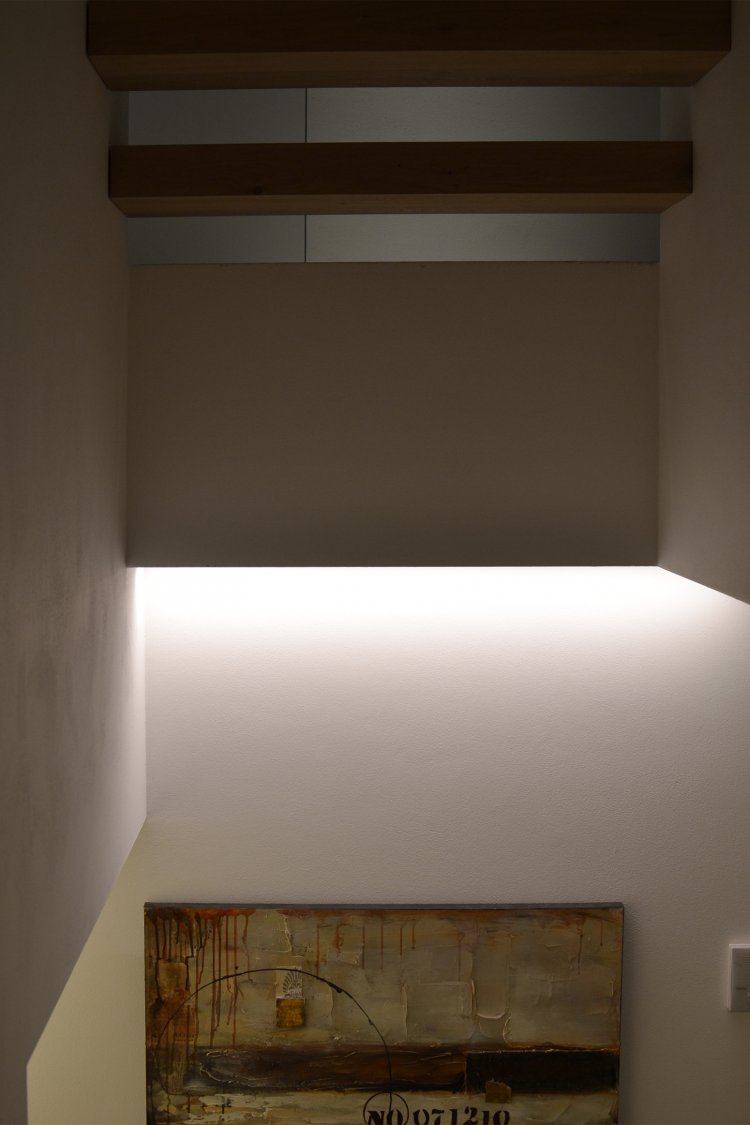 La principale sfida progettuale risiede nel realizzare un edificio a energia quasi zero, capace di ospitare due unità residenziali, senza apparire come una convenzionale bifamiliare dal tipico aspetto simmetrico. L'intero progetto si basa sull'ottimizzazione dei volumi e dell'orientamento rispetto al lotto disponibile per ottenere un volume tanto ermetico sul fronte strada a nord quanto aperto sul lato sud al fine di massimizzare i guadagni passivi e l'apporto di luce. Gli spazi interni si susseguono verticalmente scanditi dalla luce naturale proveniente dai lucernari di copertura e dalle terrazze, enfatizzando la consistenza dei materiali.