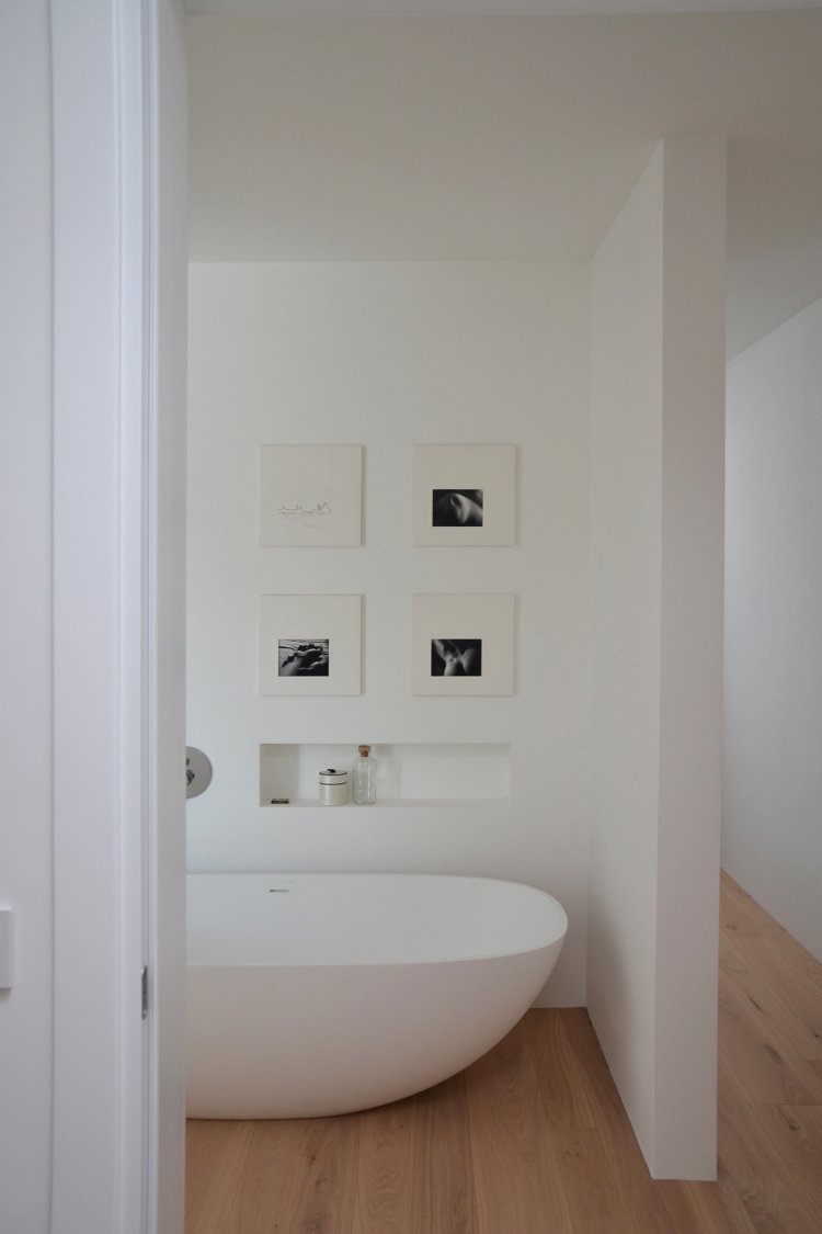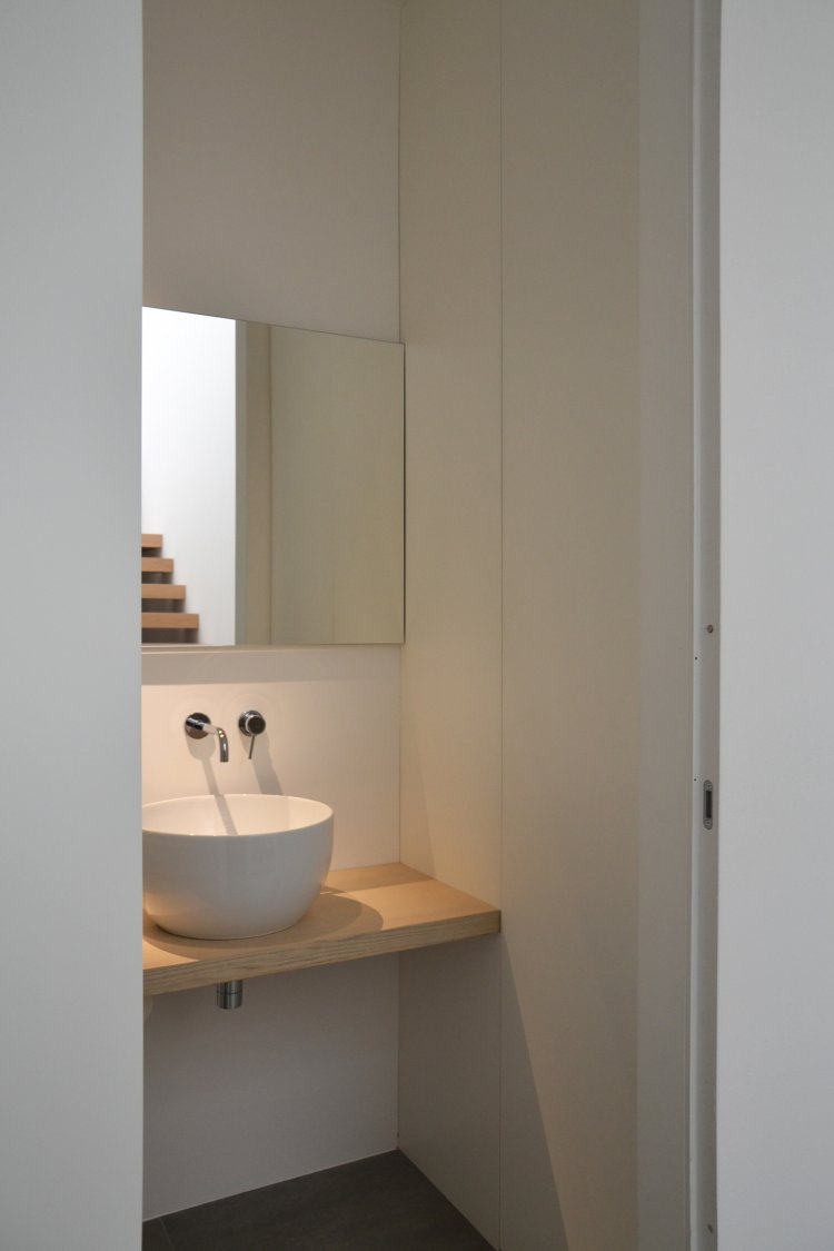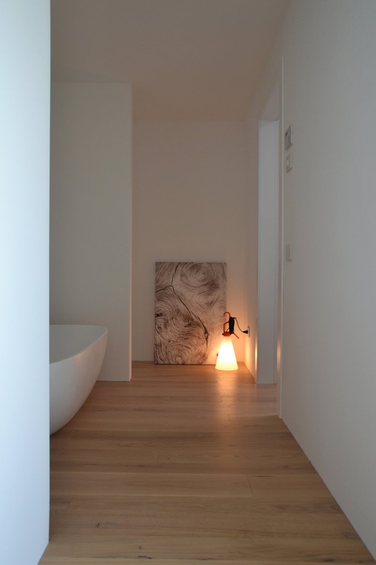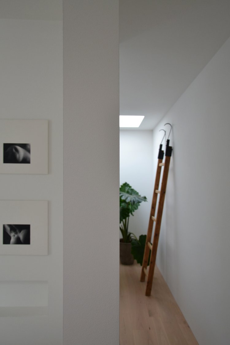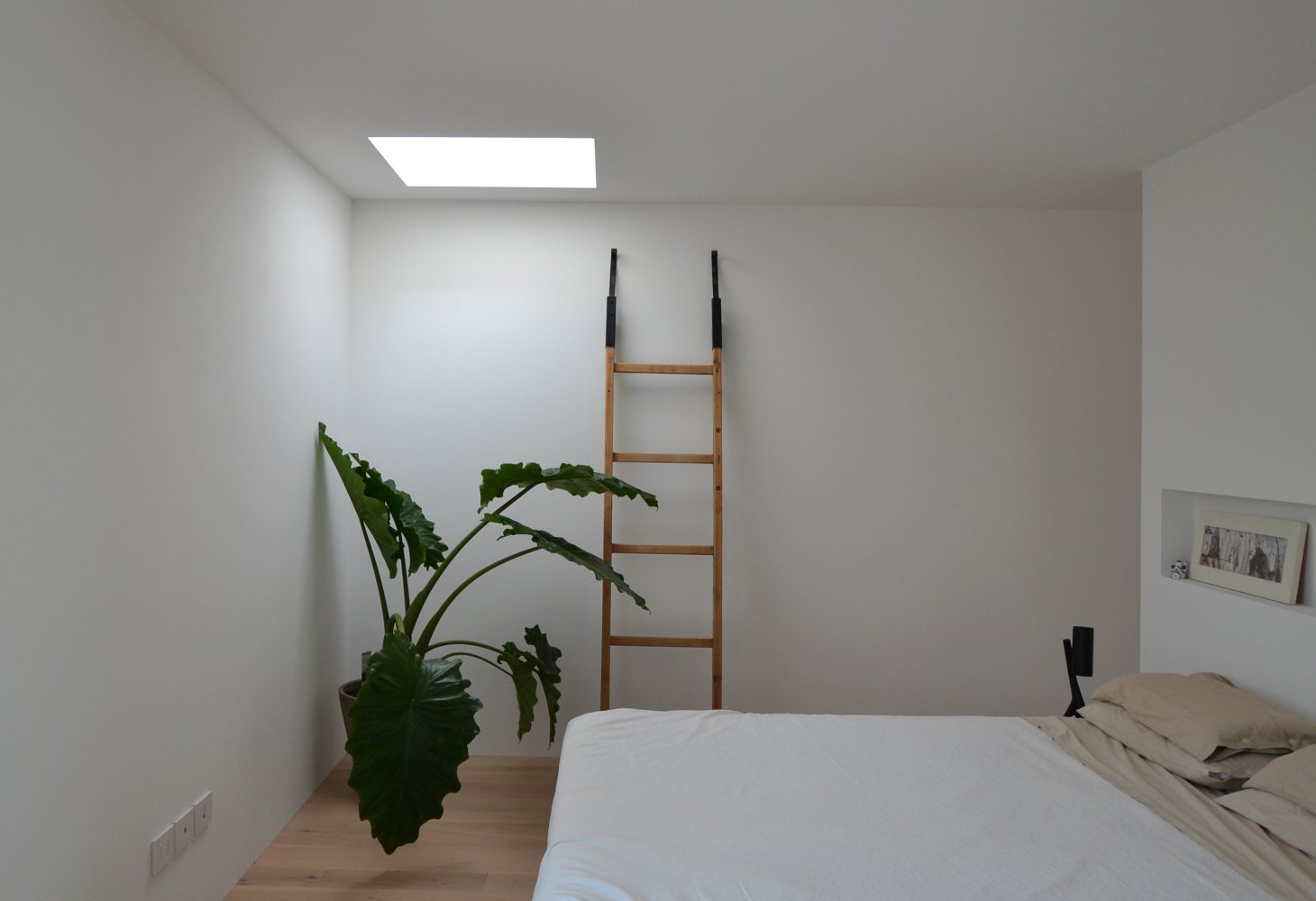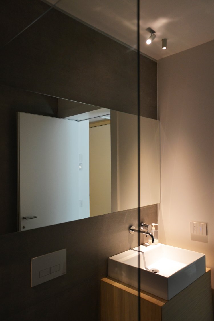 La principale sfida progettuale risiede nel realizzare un edificio a energia quasi zero, capace di ospitare due unità residenziali, senza apparire come una convenzionale bifamiliare dal tipico aspetto simmetrico. L'intero progetto si basa sull'ottimizzazione dei volumi e dell'orientamento rispetto al lotto disponibile per ottenere un volume tanto ermetico sul fronte strada a nord quanto aperto sul lato sud al fine di massimizzare i guadagni passivi e l'apporto di luce. Gli spazi interni si susseguono verticalmente scanditi dalla luce naturale proveniente dai lucernari di copertura e dalle terrazze, enfatizzando la consistenza dei materiali.