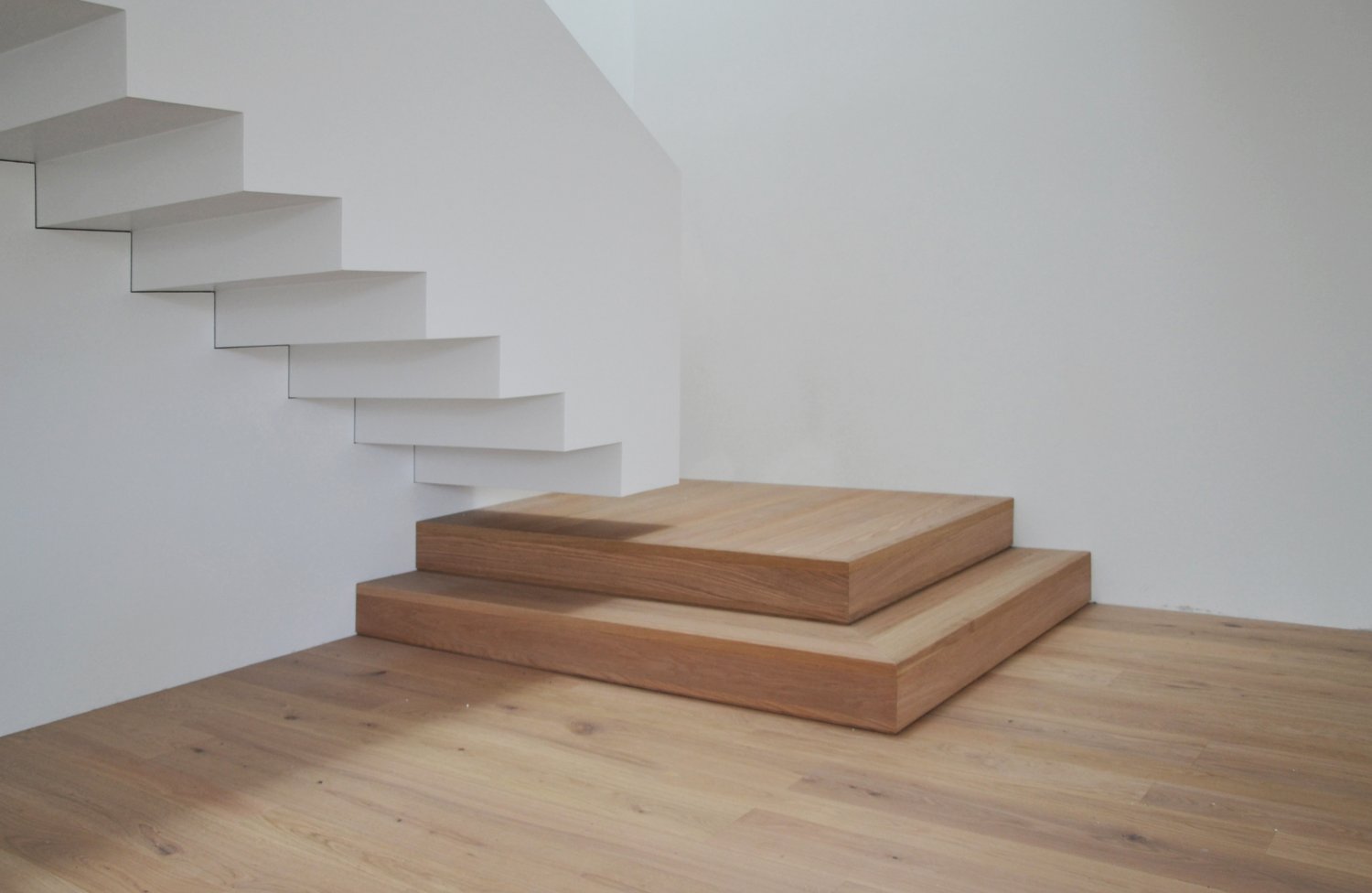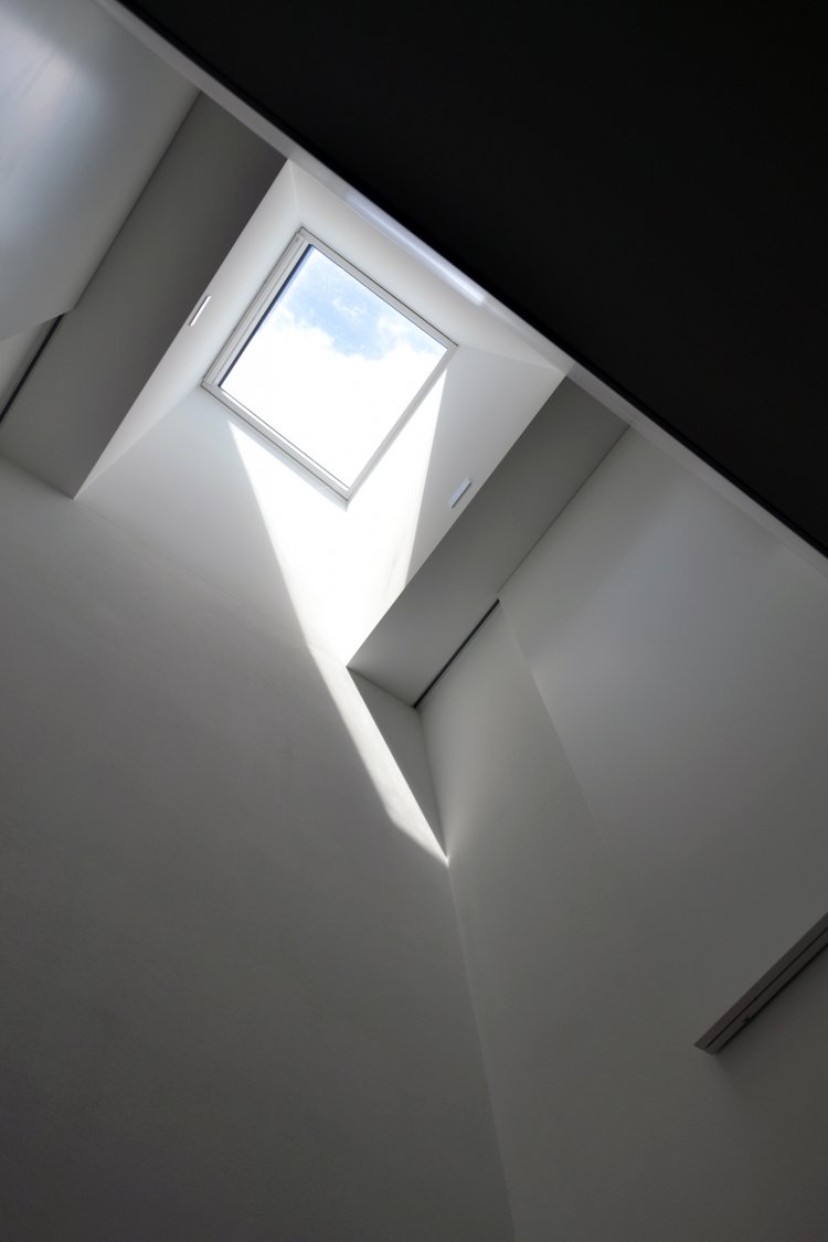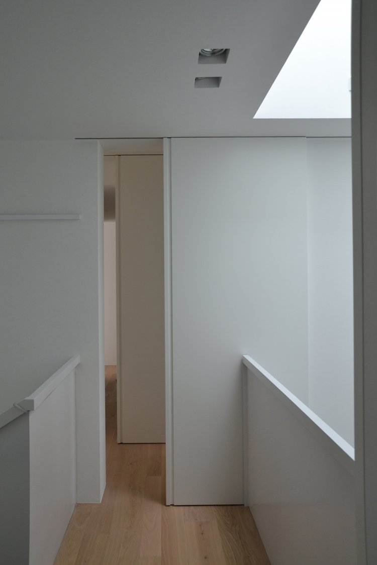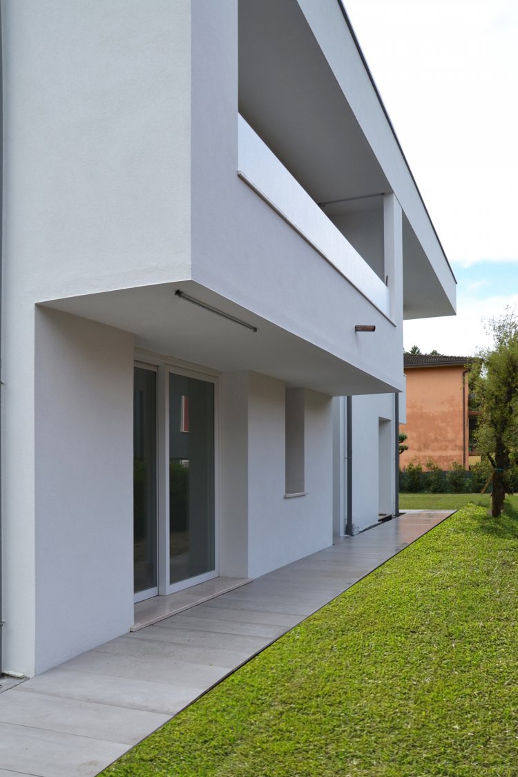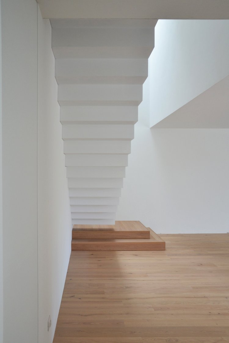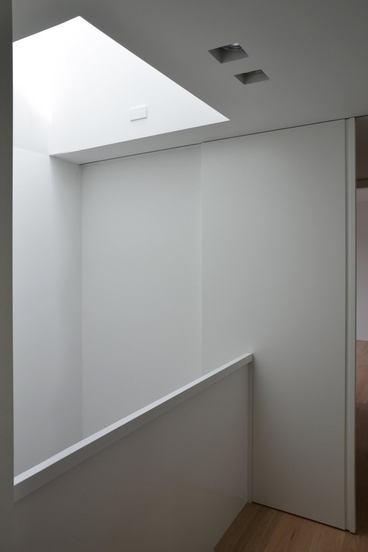 Questa abitazione in due livelli è basata su una chiara suddivisione funzionale in due blocchi, separati da uno spazio verticale in cui una scala a sbalzo trova posto come una scultura indirizzando tutti i flussi distributivi principali. Due lucernari permettono alla luce naturale di spiovere sull’ingresso, sulla parete e sulla scala creando un’inaspettata atmosfera che varia nell’arco del giorno. Gli spazi interni trovano la loro naturale estensione nel giardino e nelle terrazze che assicurano un adeguato ombreggiamento in estate.