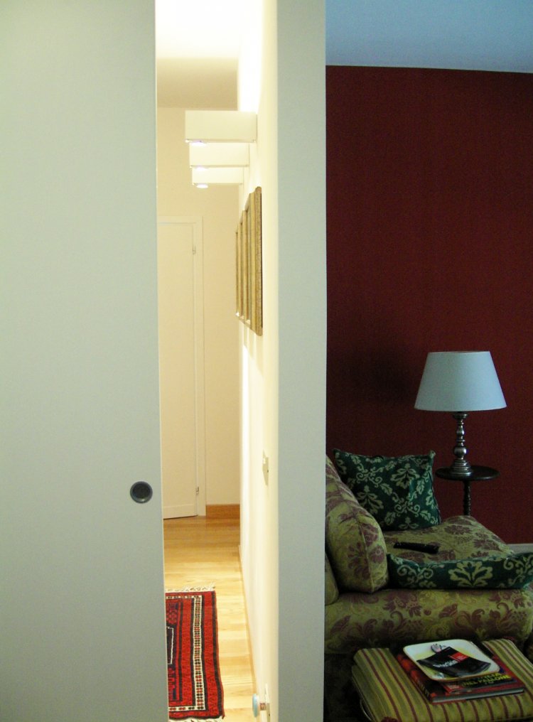La riconfigurazione di questa unità abitativa è basato sull’impiego di una serie di elementi scorrevoli tesi a creare uno spazio flessibile e fluido che modifichi la rigida griglia distributiva della casa. Ciò permette di ospitare nuove funzioni e di creare nuovi effetti utilizzando i colori e la luce per riflettere il senso di libertà del proprietario.